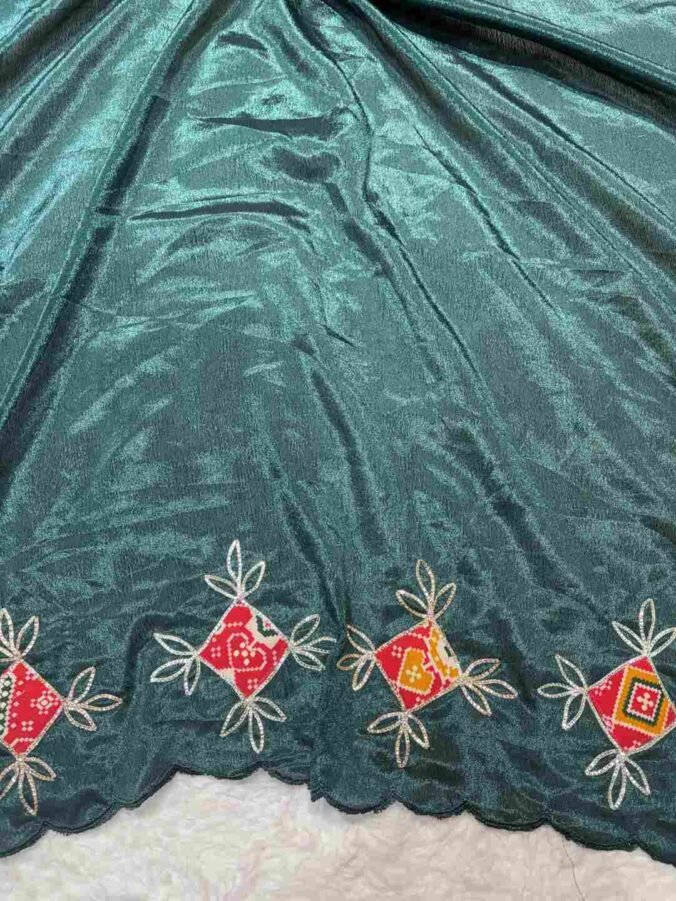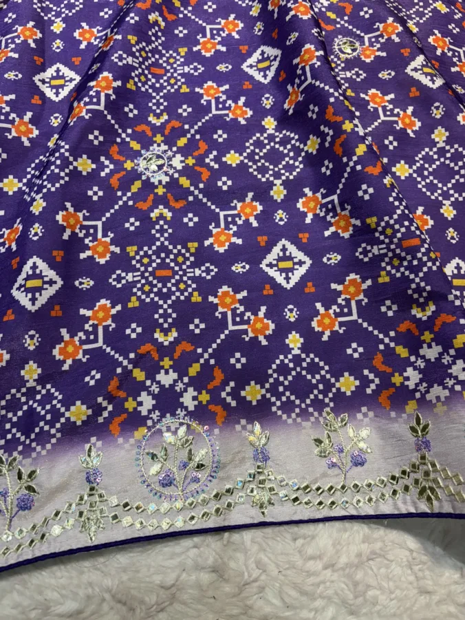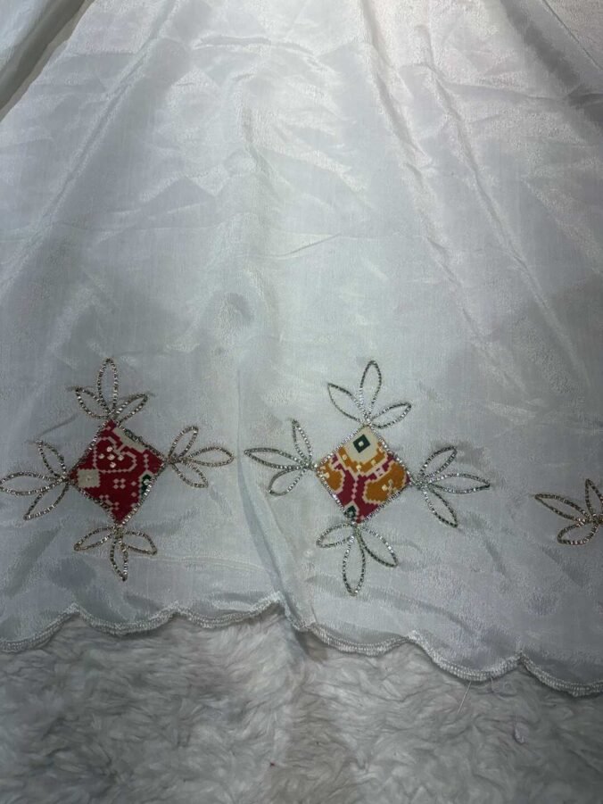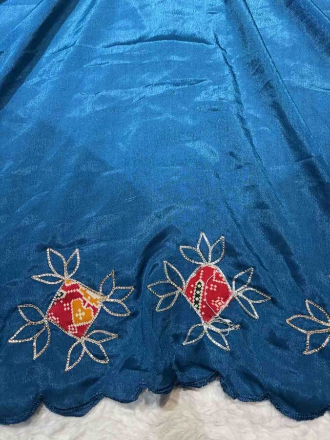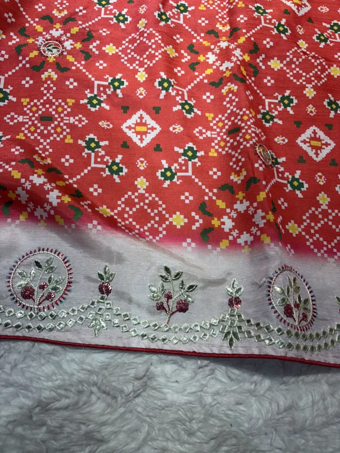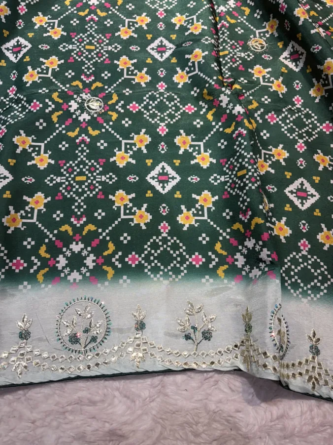 A stunning fusion of artistry: Vibrant Patola prints are beautifully enhanced with intricate all-over Kasida work, creating a rich, festive drape that feels traditional, detailed, and effortlessly luxurious.