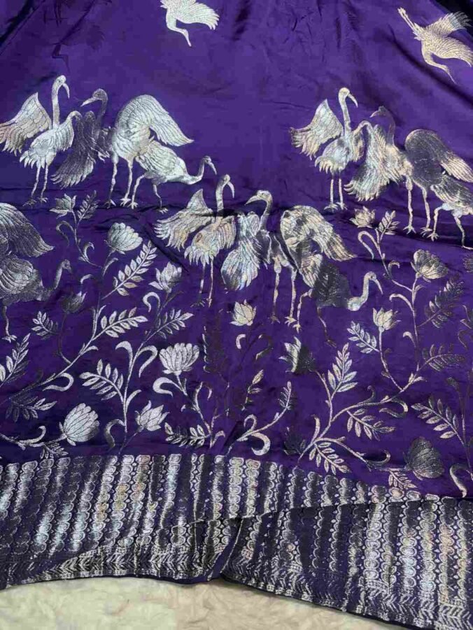 A stunning fusion of artistry: Pure H.O Silk fabric is elegantly enriched with shimmering silver Zari all over, creating a rich, regal drape that feels luxurious, graceful, and timelessly elegant.