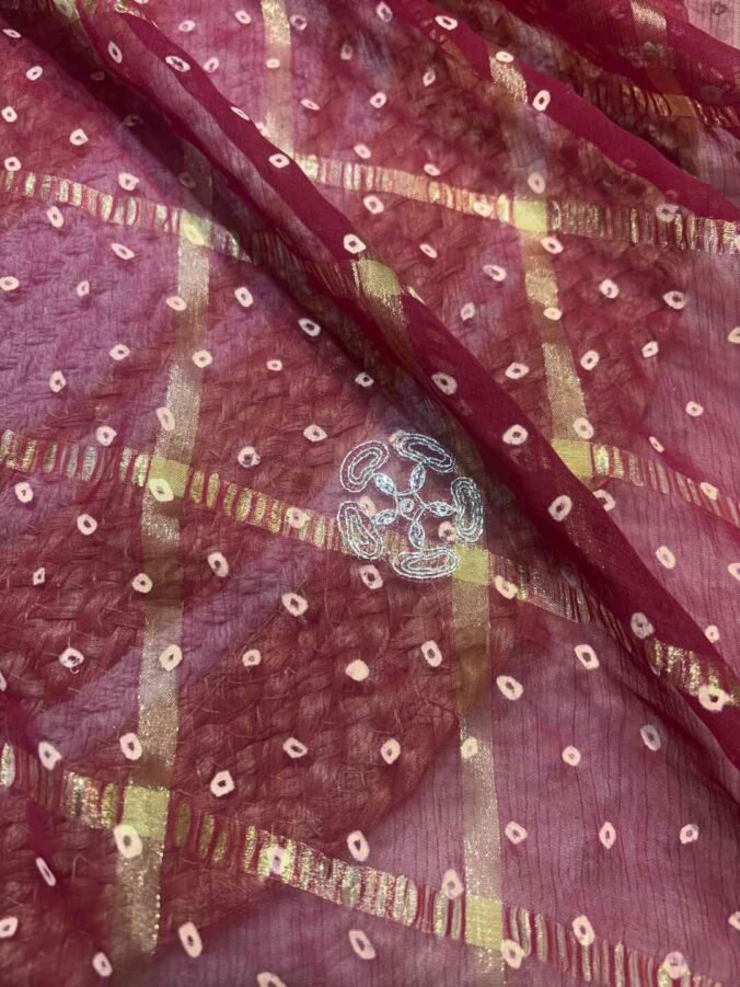 To maintain the clarity of the Bandhej patterns and the vibrancy of the colors, it is essential to Dry Clean Only. Avoid machine washing and twisting the fabric to preserve the hand-tied texture and the color integrity.