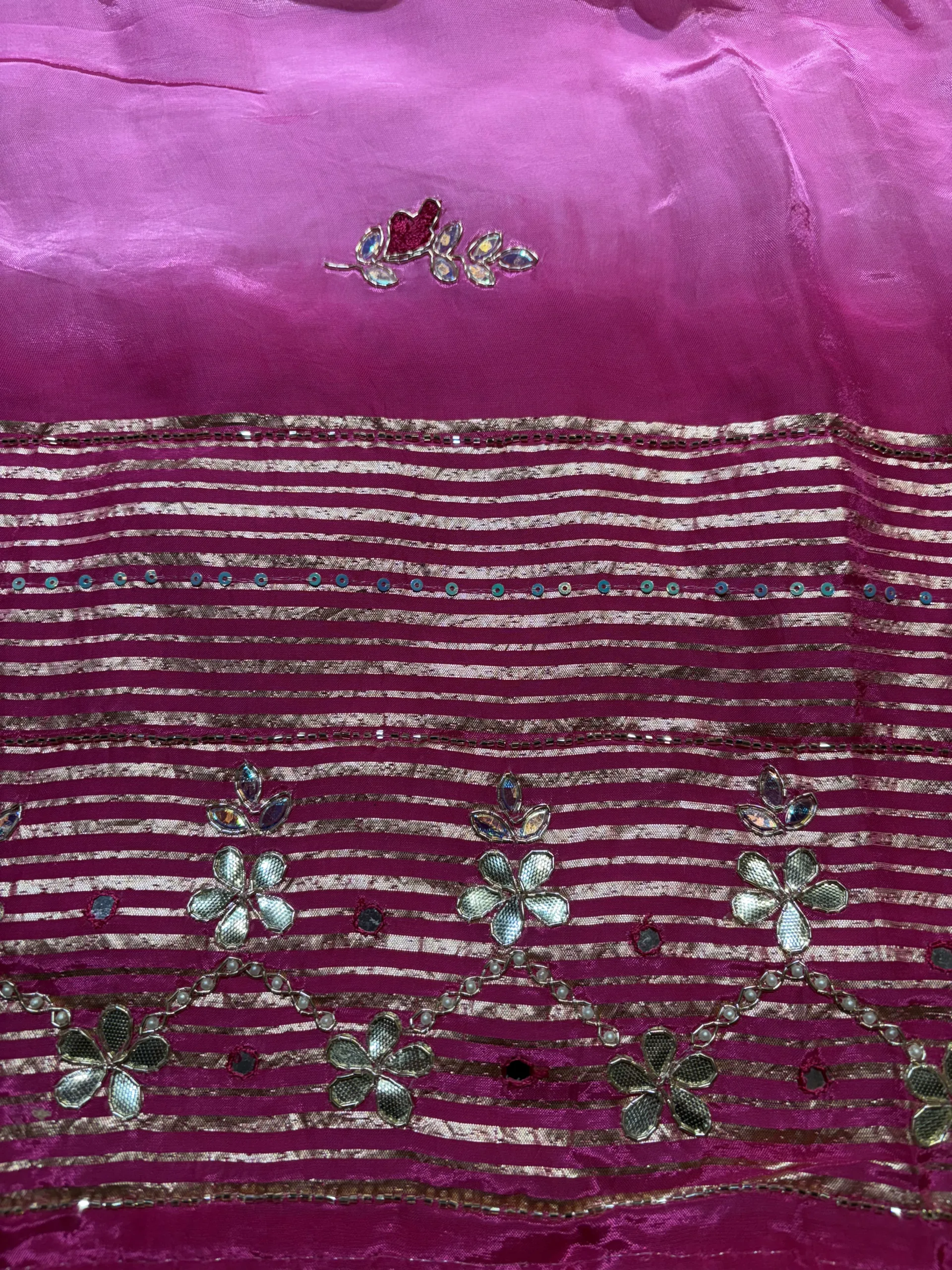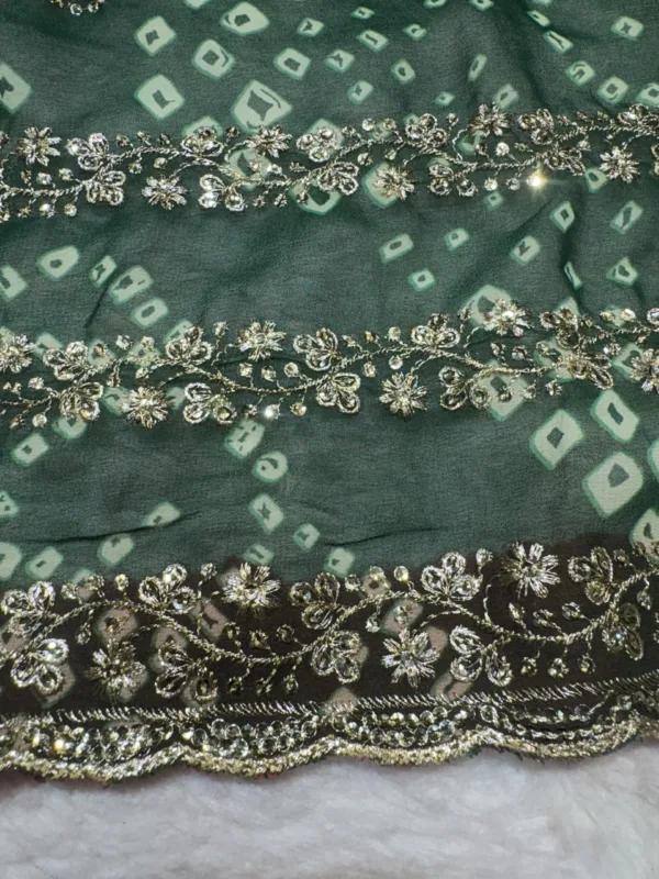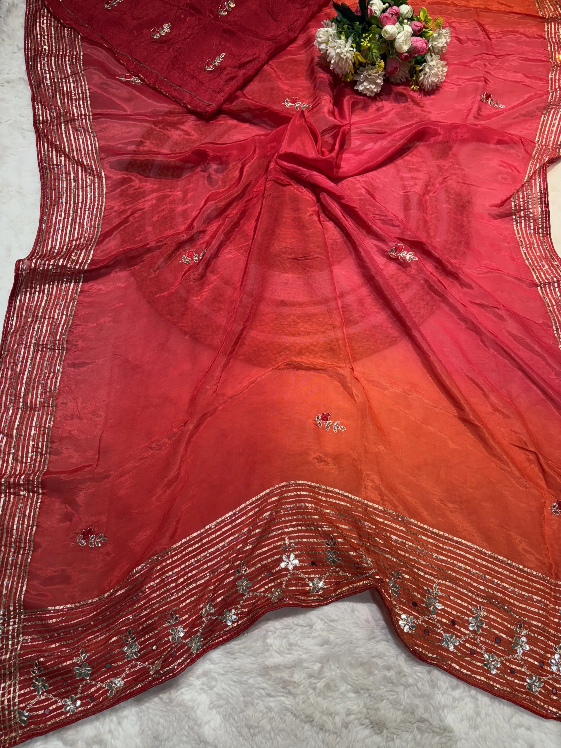 • Intricate embroidery, zari, sequins, or threadwork spread across the saree