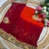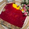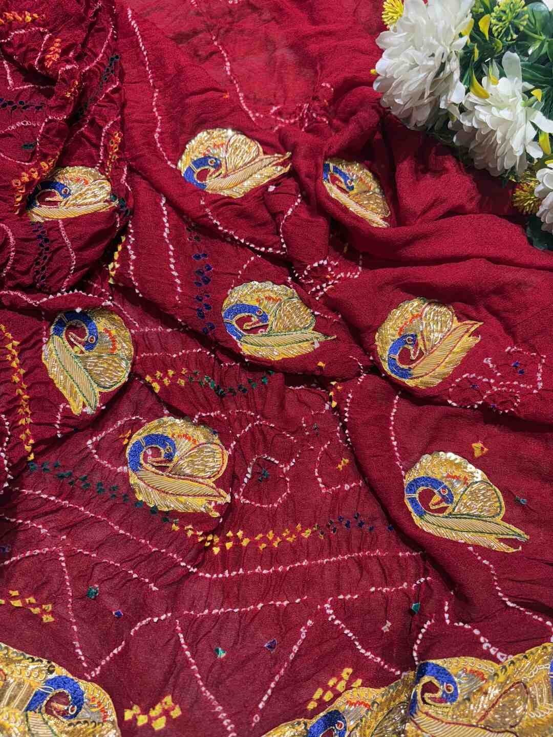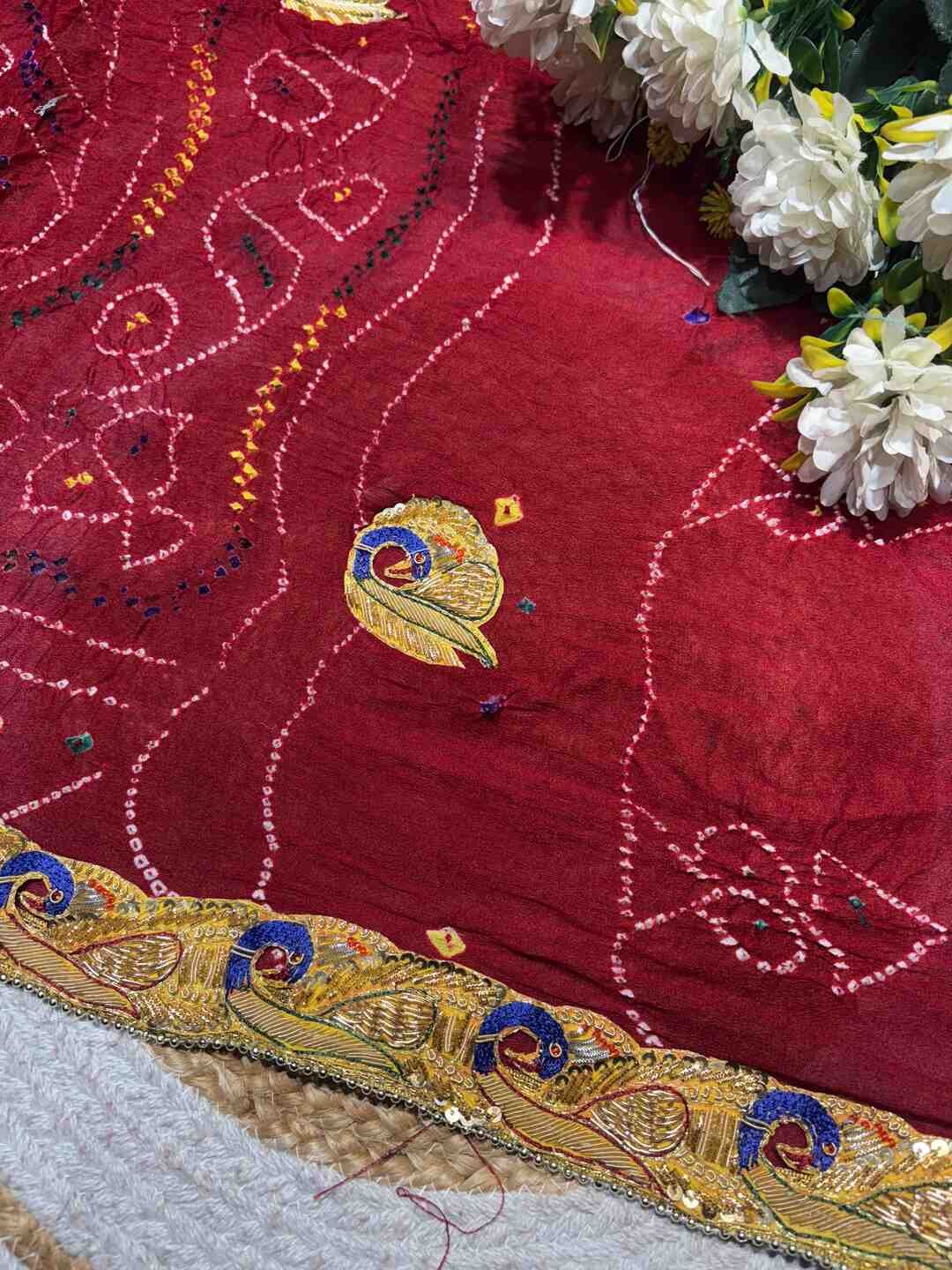 A stunning fusion of artistry: This exclusive collection features pure Bandhej Pomcha, pure Bandhej Chunri, and pure Bandhej Piliya—each crafted with authentic traditional techniques, offering vibrant colours, cultural richness, and a beautifully festive drape that feels timeless and elegant.