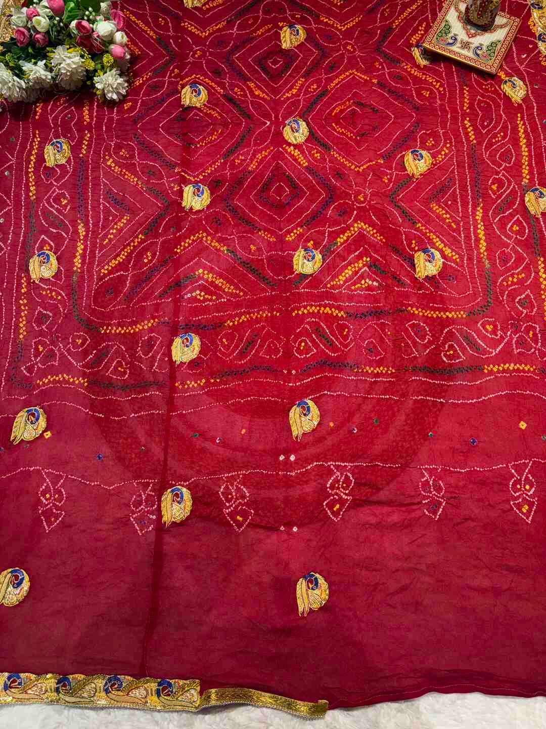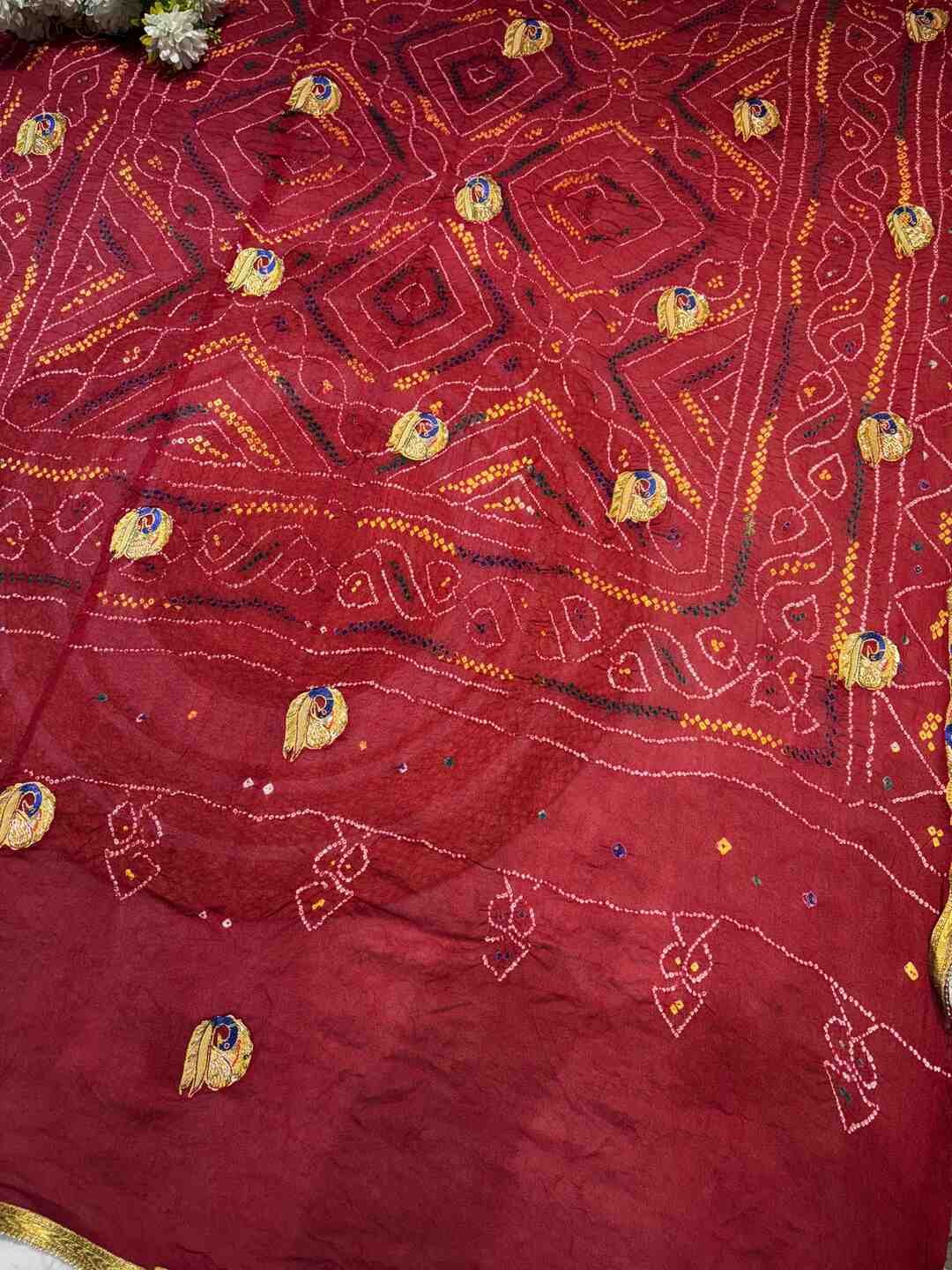 This saree features a unique 3-part Bandhej combination, each section showcasing a different traditional style.