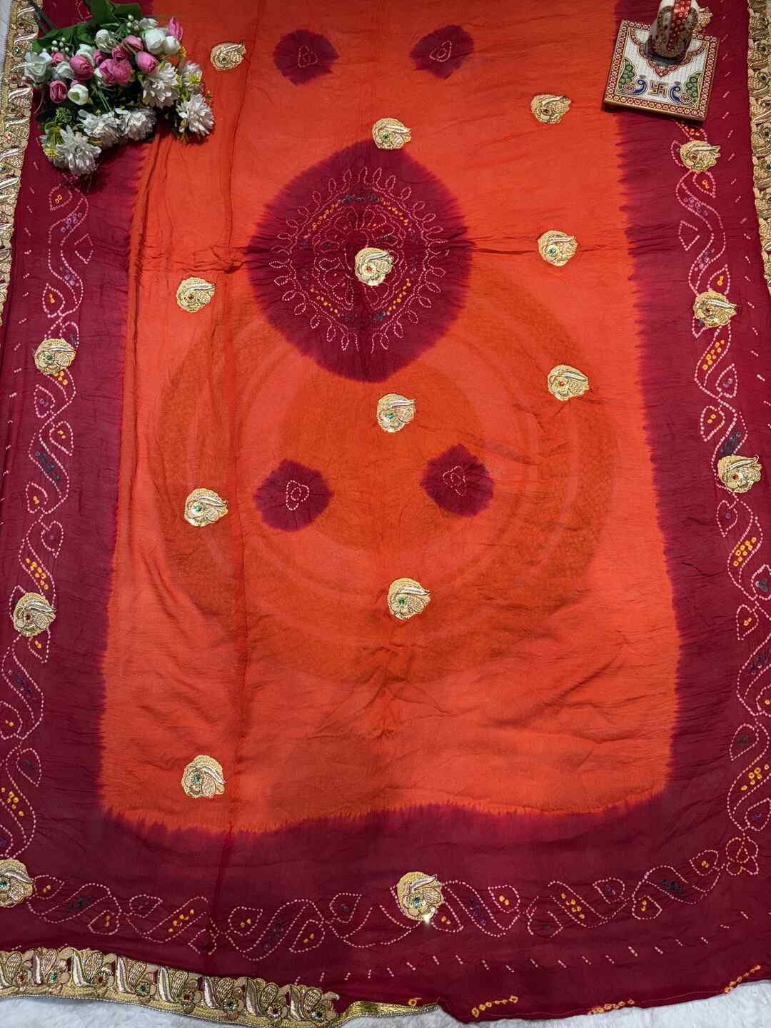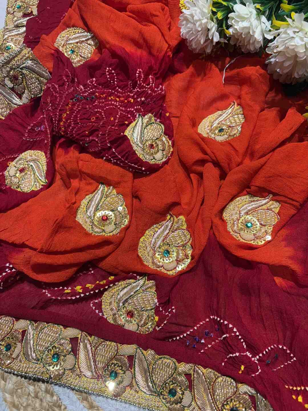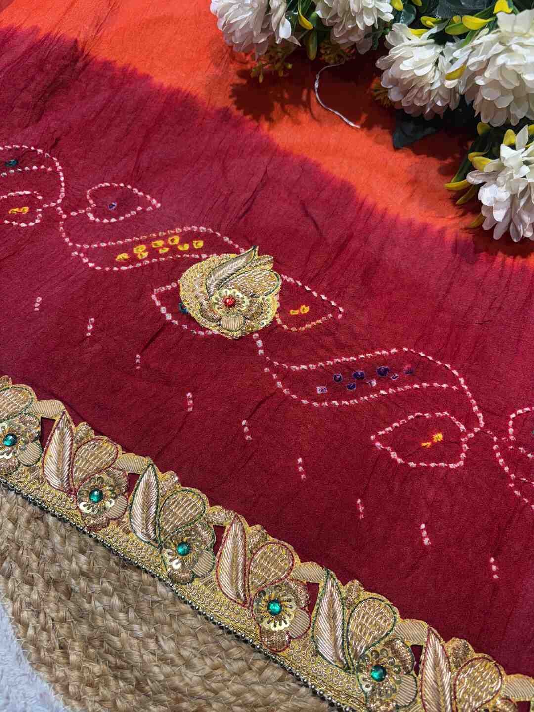 This saree features a unique 3-part Bandhej combination, each section showcasing a different traditional style.