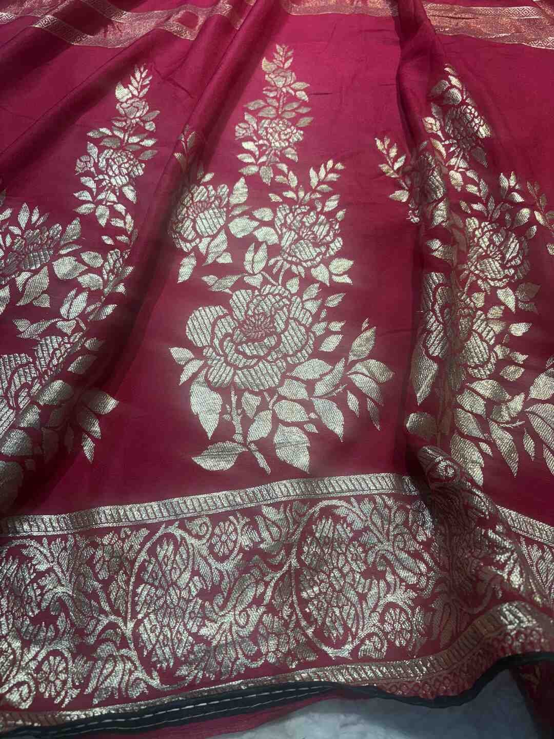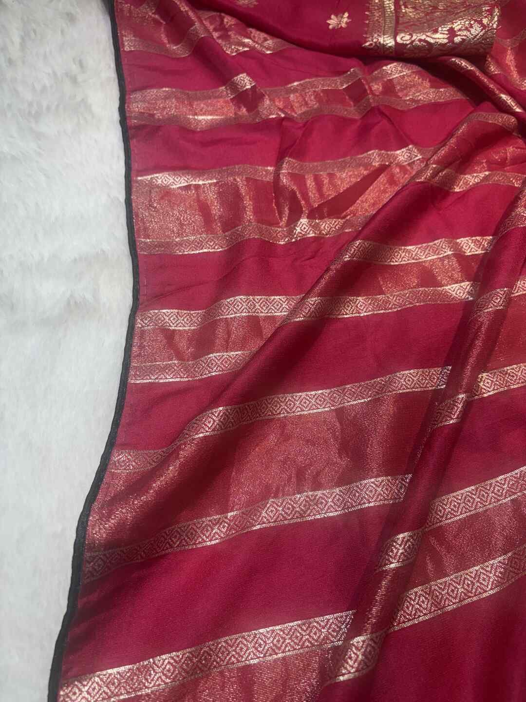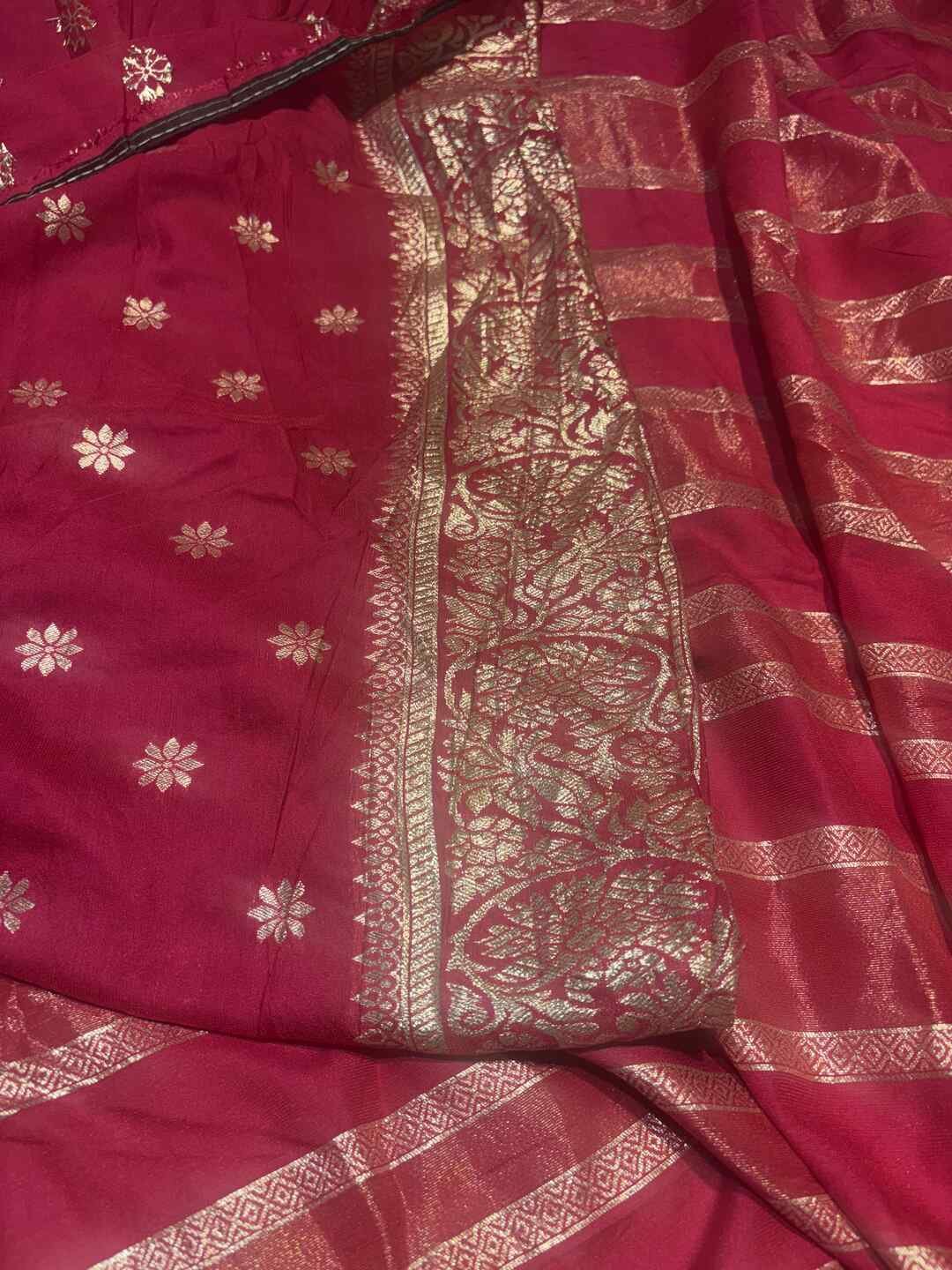 A stunning fusion of artistry: The timeless charm of Banarasi weaving comes alive on soft Silk fabric, creating a rich, graceful drape that feels traditional, regal, and effortlessly luxurious.