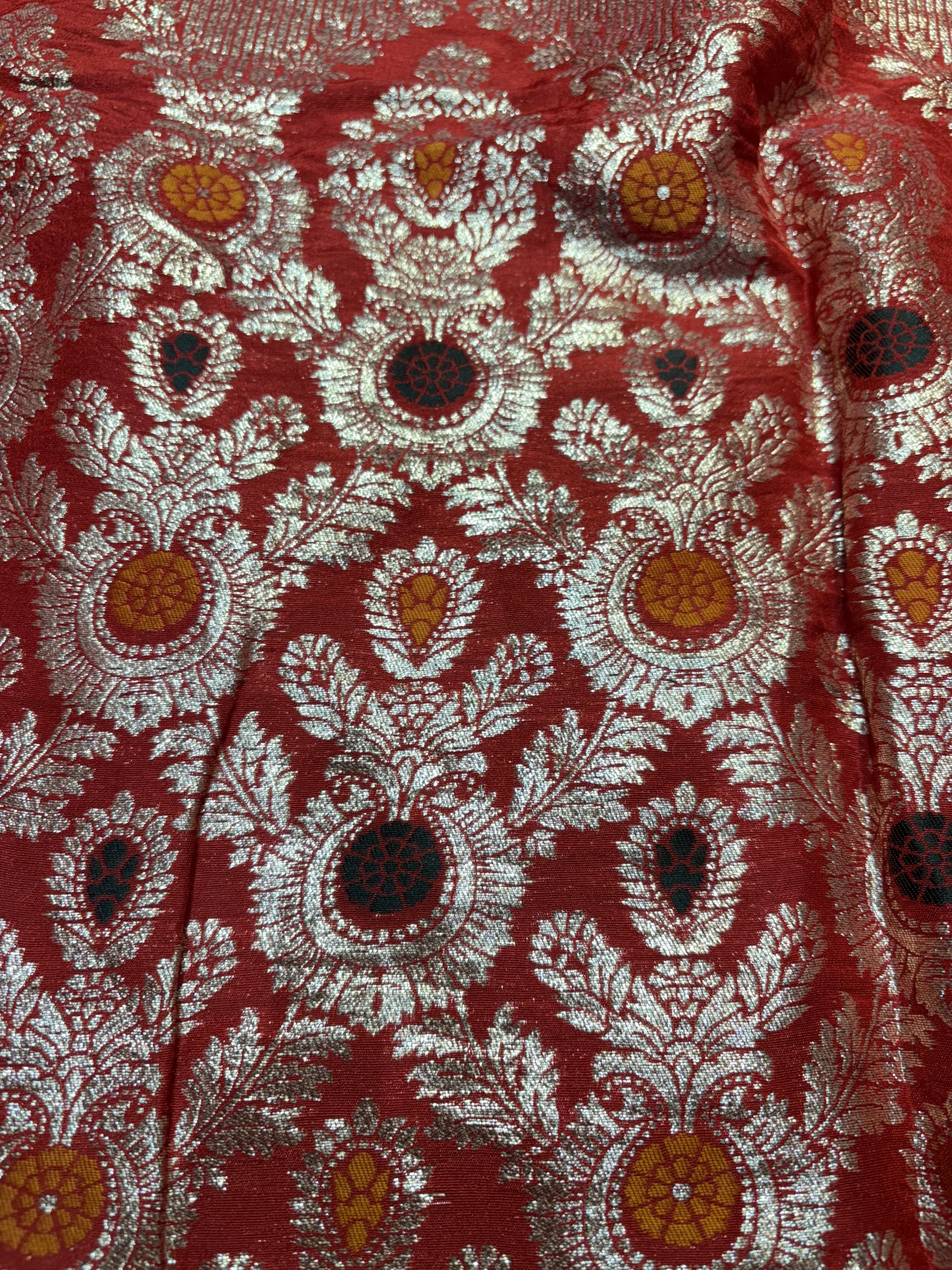 The foundation is the vibrant, culturally significant Red Colour, symbolizing love, prosperity, and joy. The saree is generously adorned with magnificent [Gold/Silver/Antique] Zari work, featuring traditional and intricate motifs like Mughal-inspired Jaal, classic Kairi (Paisleys), or dense floral patterns. The rich weaving showcases the artistry of Banaras, with a grand, often heavily woven pallu that transforms the saree into an heirloom piece.