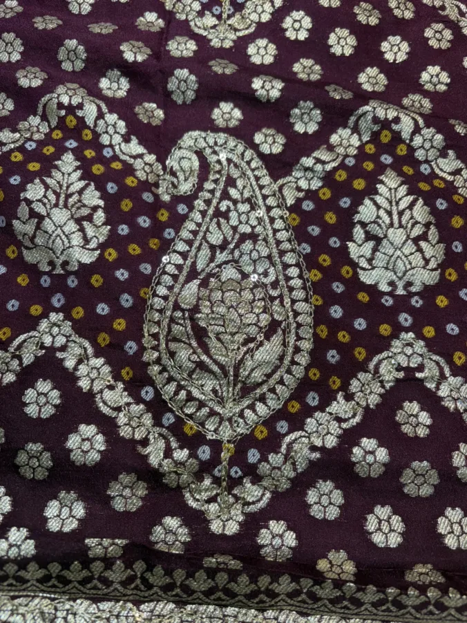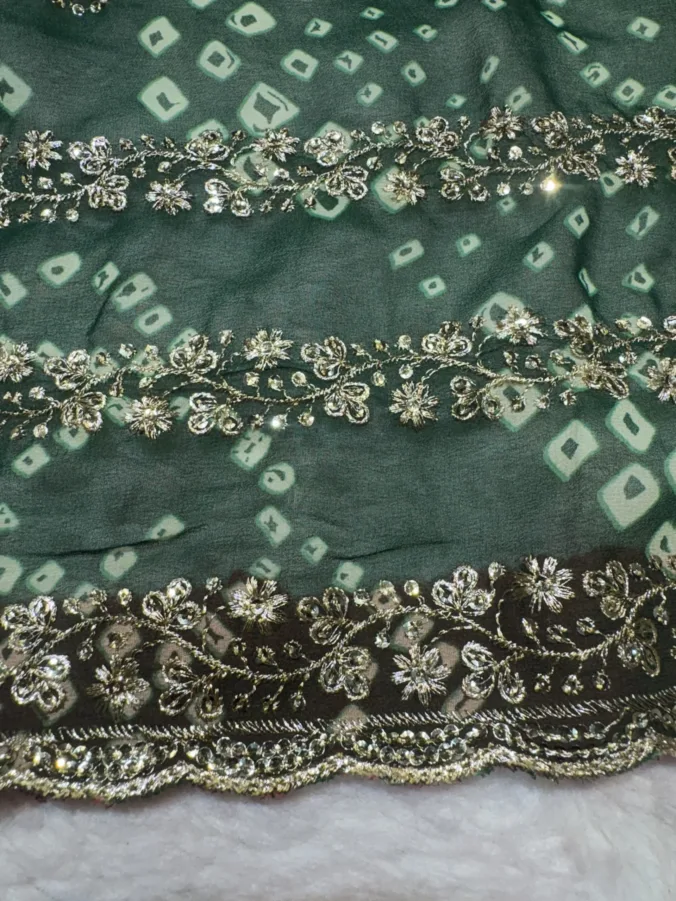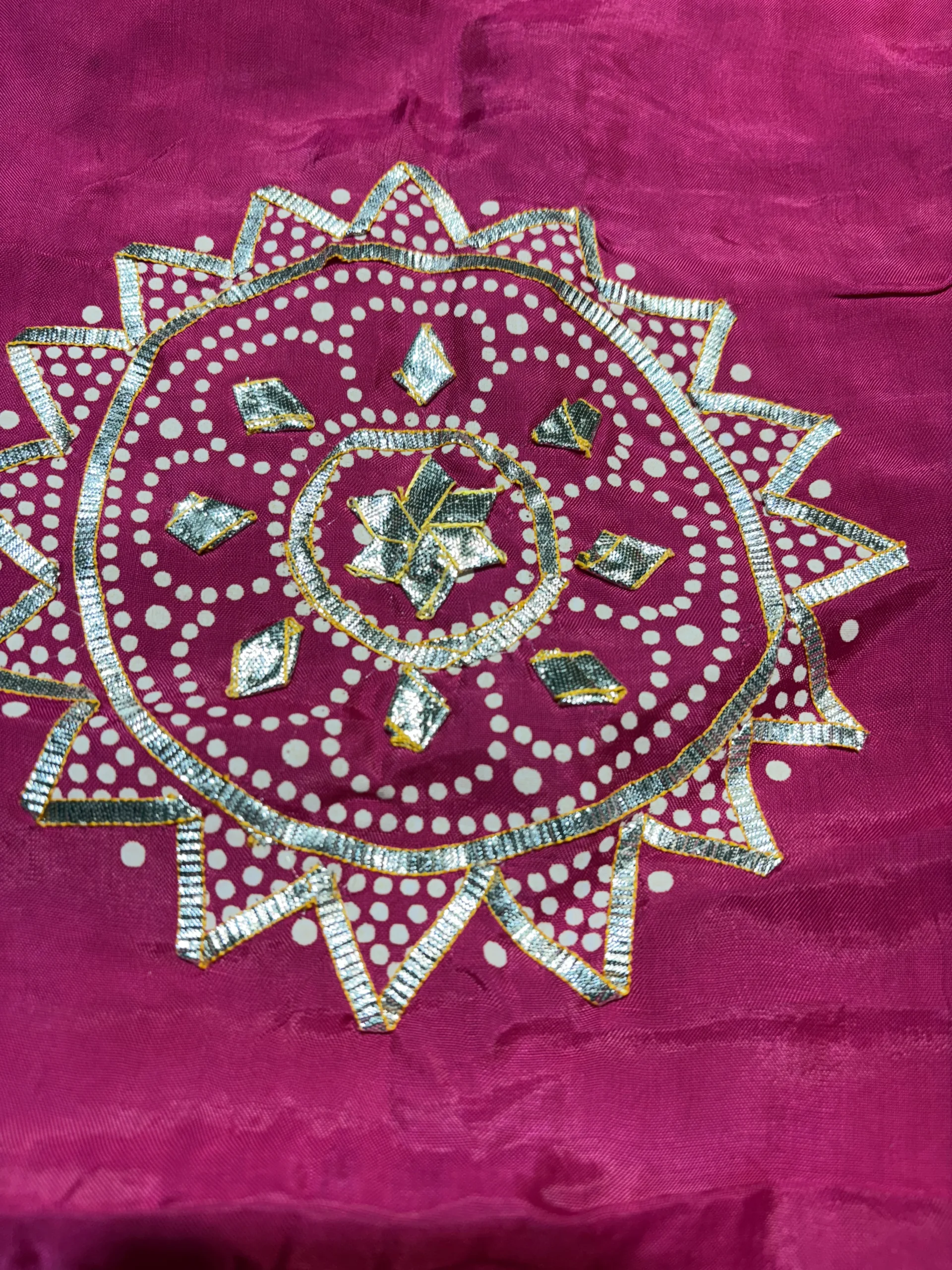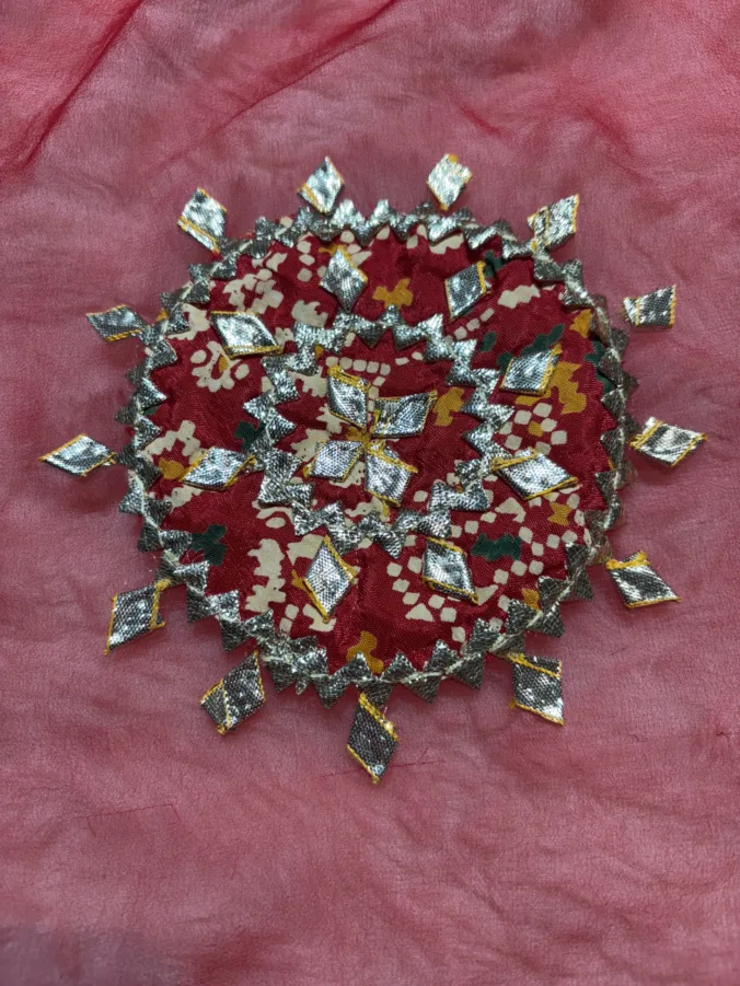 The saree features authentic Bandhani (Bandhej) Work, where the meticulous, hand-tied knots create vibrant, precise patterns of dots, waves, or traditional motifs. This classic, colorful base is then elegantly highlighted with delicate Kacha Gotta Work, which involves the hand-application of metallic ribbons (Gota) to form shimmering accents, borders, or scattered buttas. The combination is visually striking, blending the rich depth of tie-dye with the light-catching sparkle of the Gotta Patti.