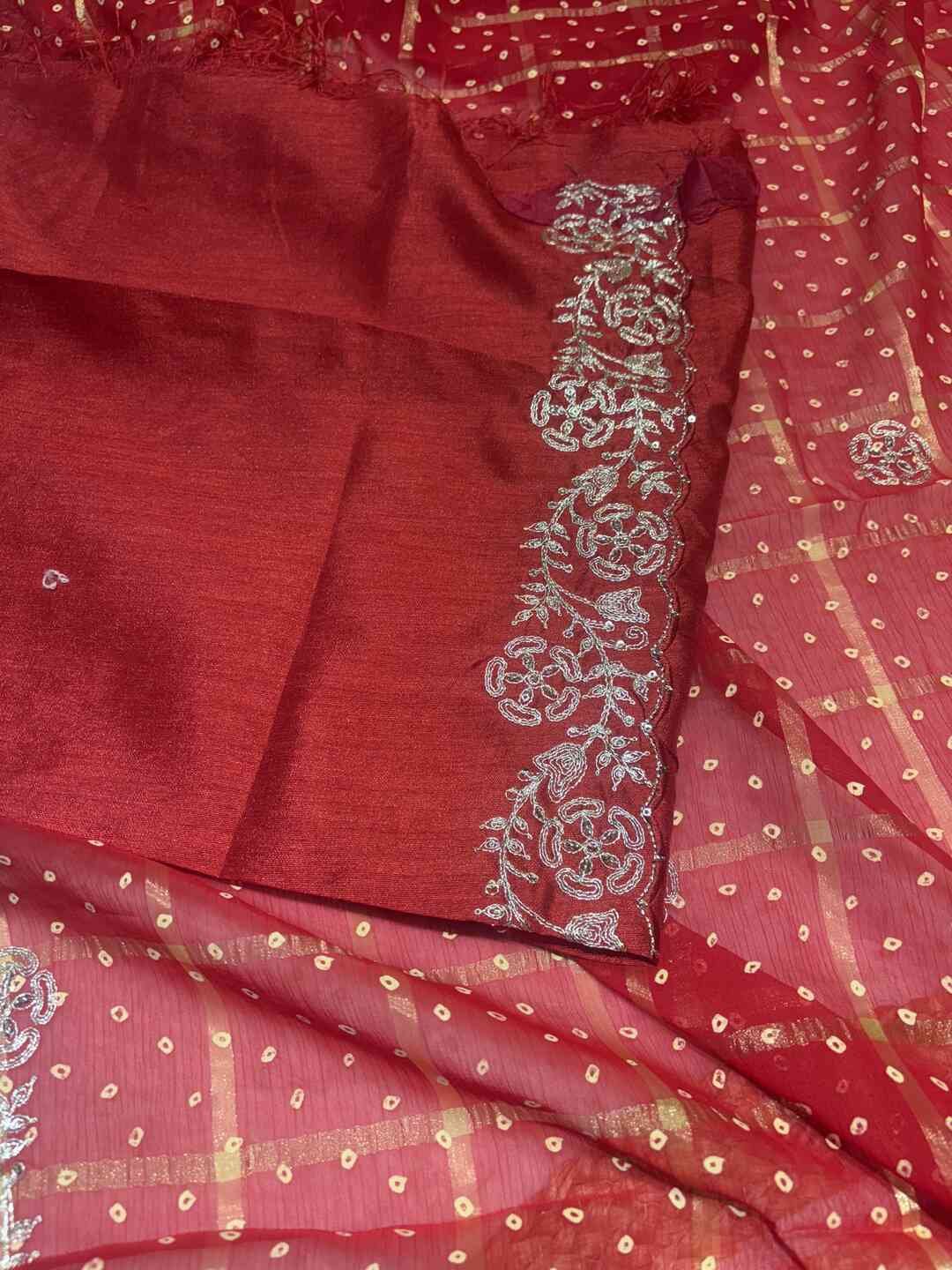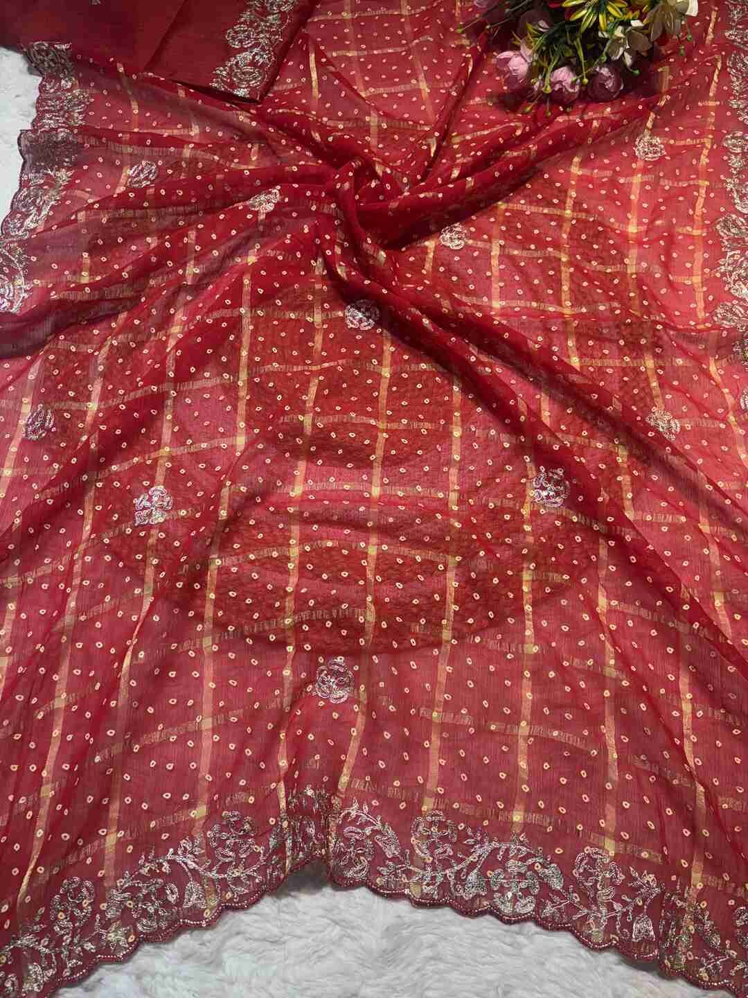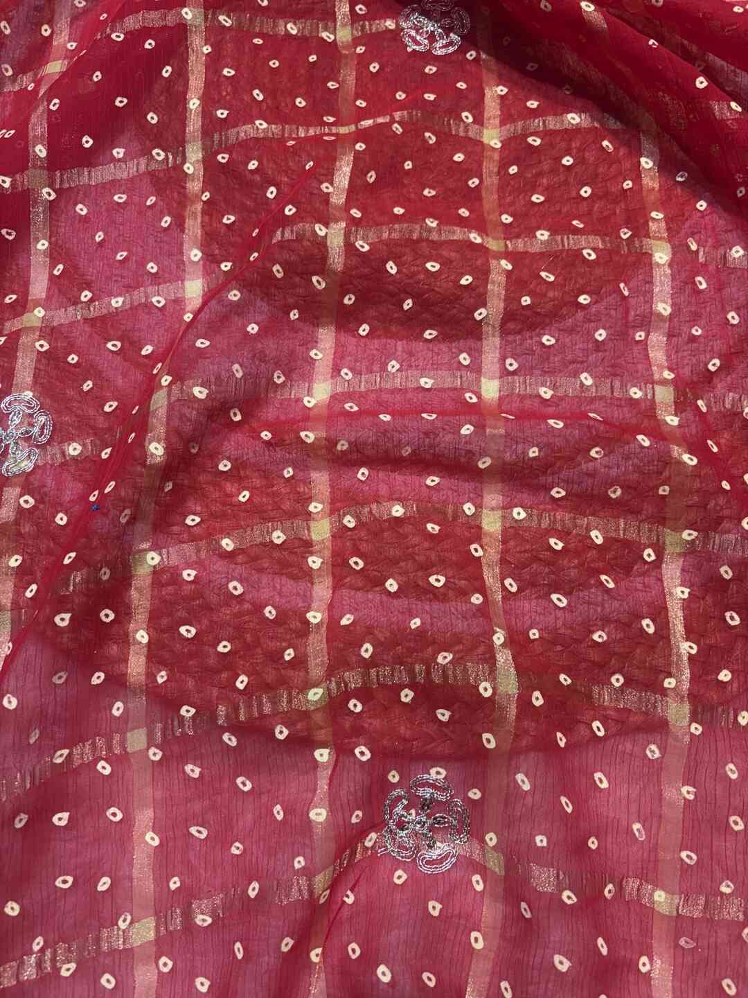 A stunning fusion of artistry: Traditional Bandhej and Ghatchola patterns unite beautifully, enhanced with intricate Pittan work on rich red tones, creating a festive, regal drape that feels luxurious, vibrant, and effortlessly eye-catching.