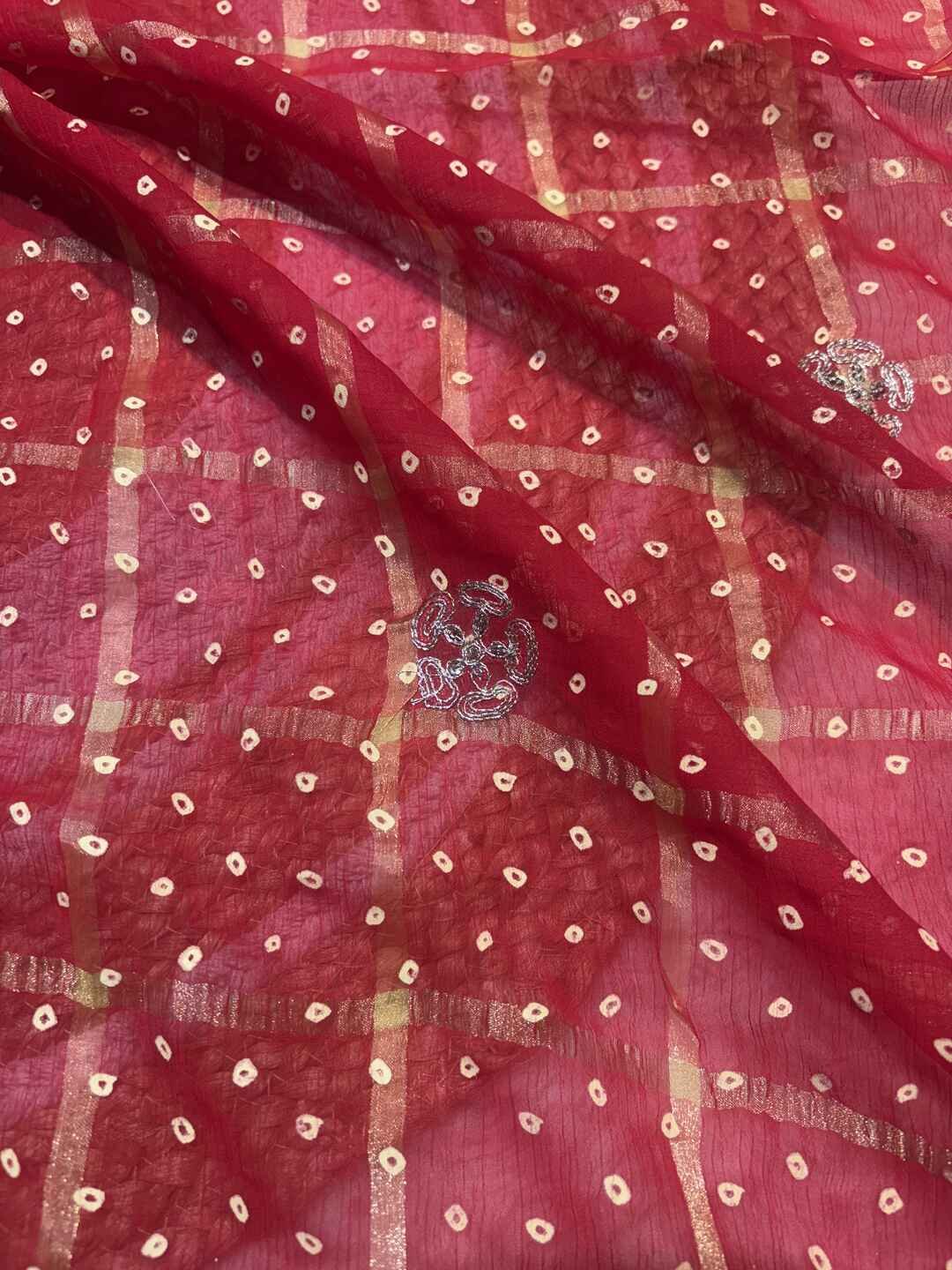 The fabric beautifully highlights the contrast Bandhej dots and Ghatchola checks.