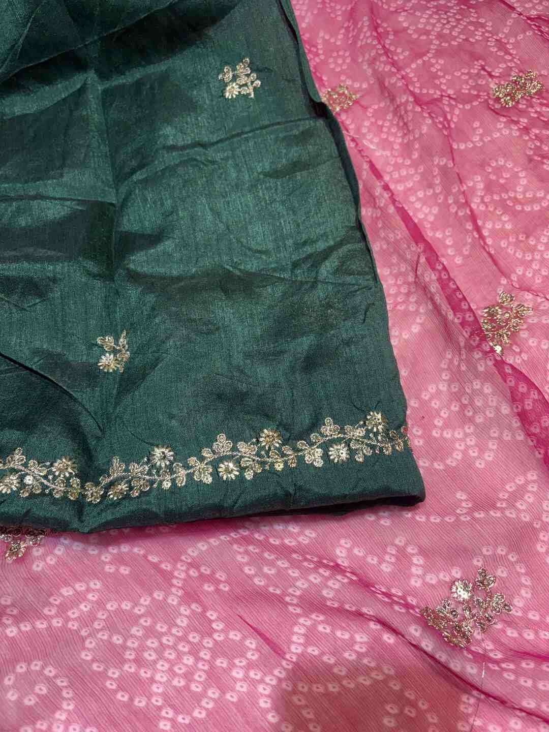This saree features a classic Bandhej base combined with modern Three Line Work, giving it a fresh and trendy ethnic appeal.