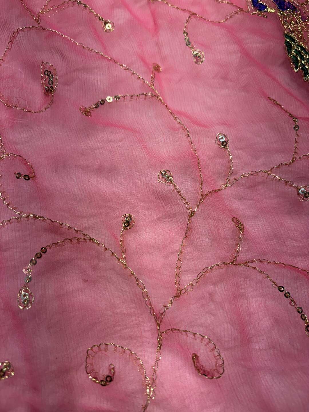 Beautiful floral and vine motifs woven or embroidered throughout
