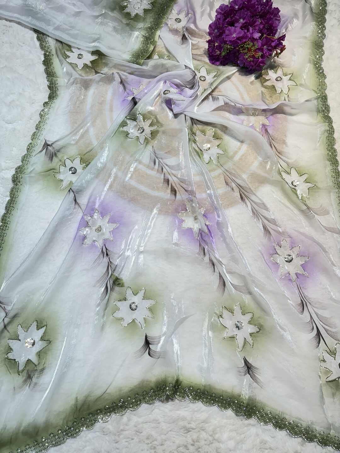 A stunning fusion of artistry: This designer saree features modern detailing and elegant craftsmanship, creating a stylish, high-fashion drape that feels chic, graceful, and effortlessly luxurious.