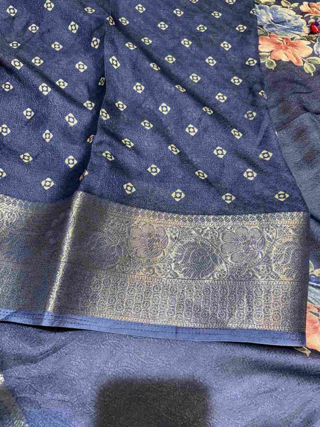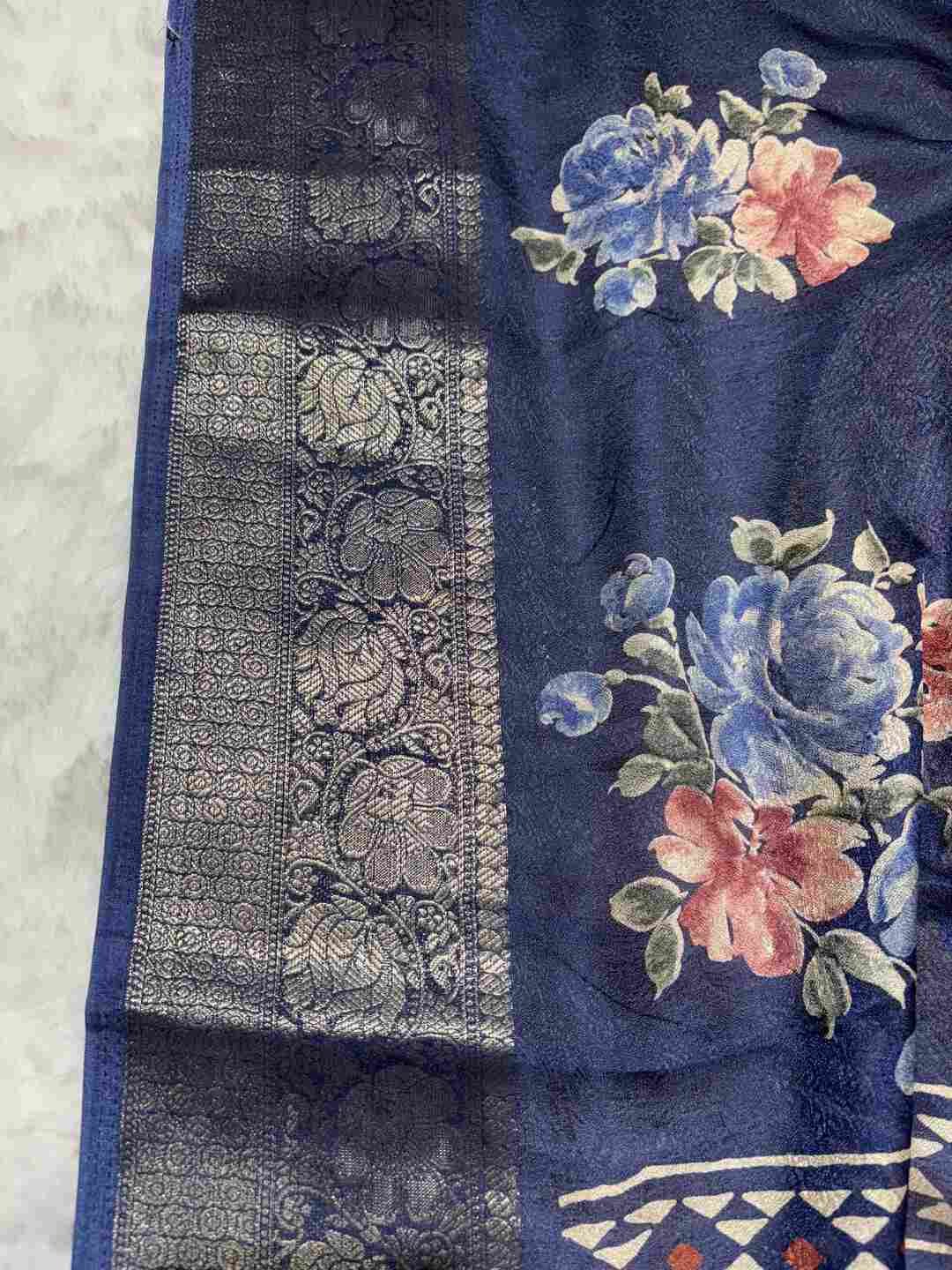 This saree features Digital Print work, giving it a fresh, modern, and practical everyday look.