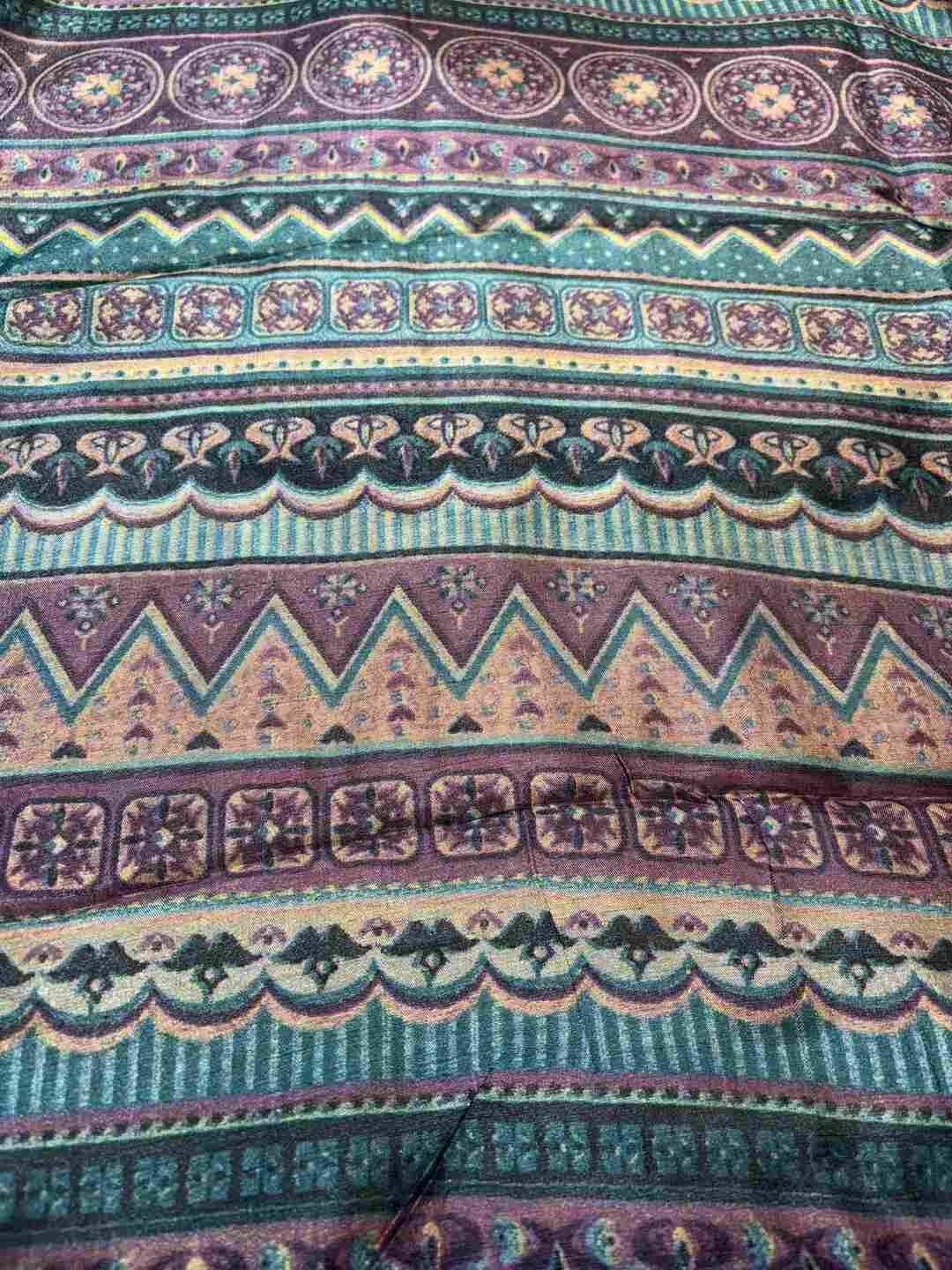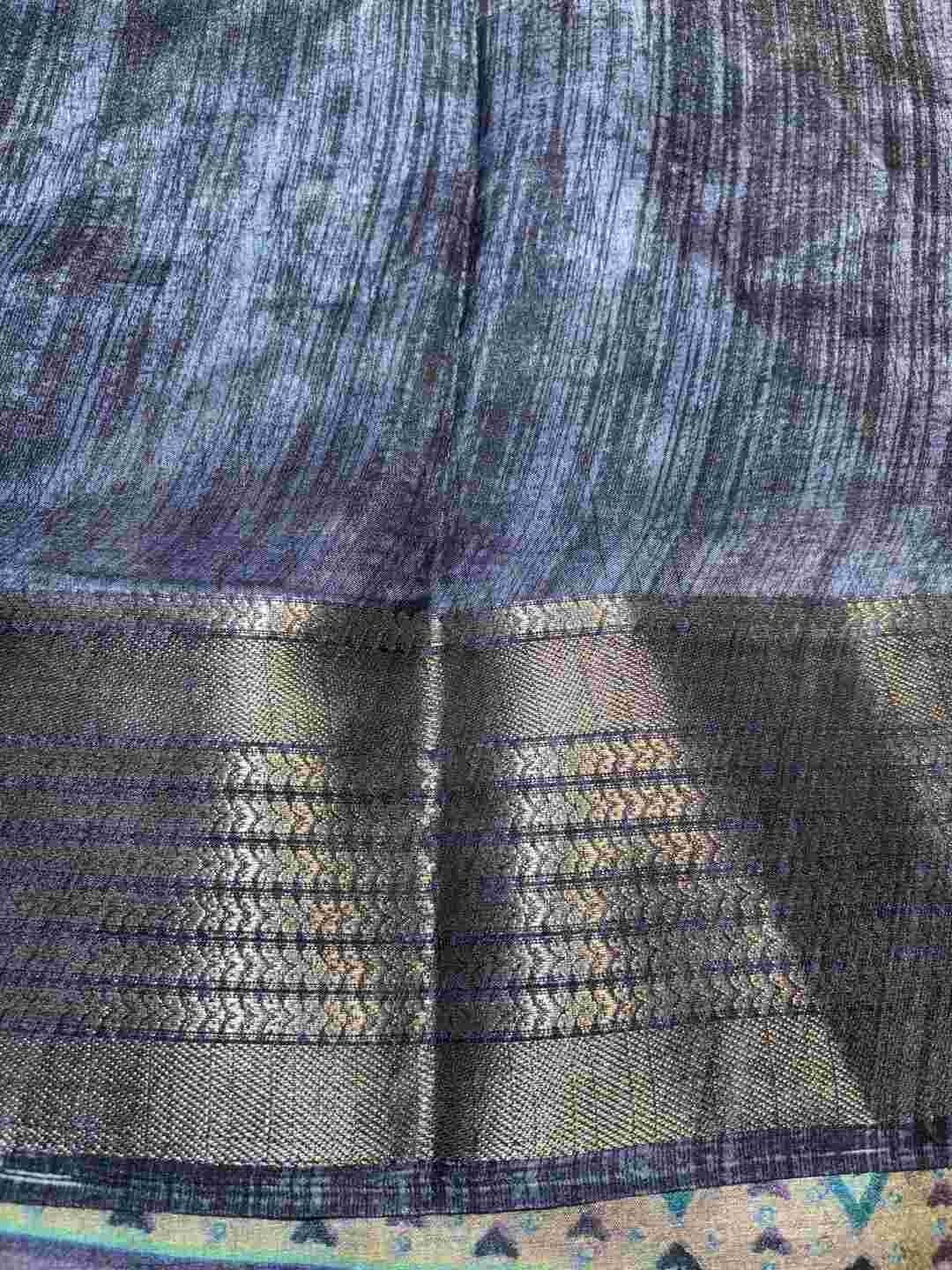 A stunning fusion of artistry: Vibrant digital prints come alive on soft Silk fabric, beautifully finished with an all-over Zari border, creating a rich, graceful drape that feels modern, festive, and effortlessly luxurious.