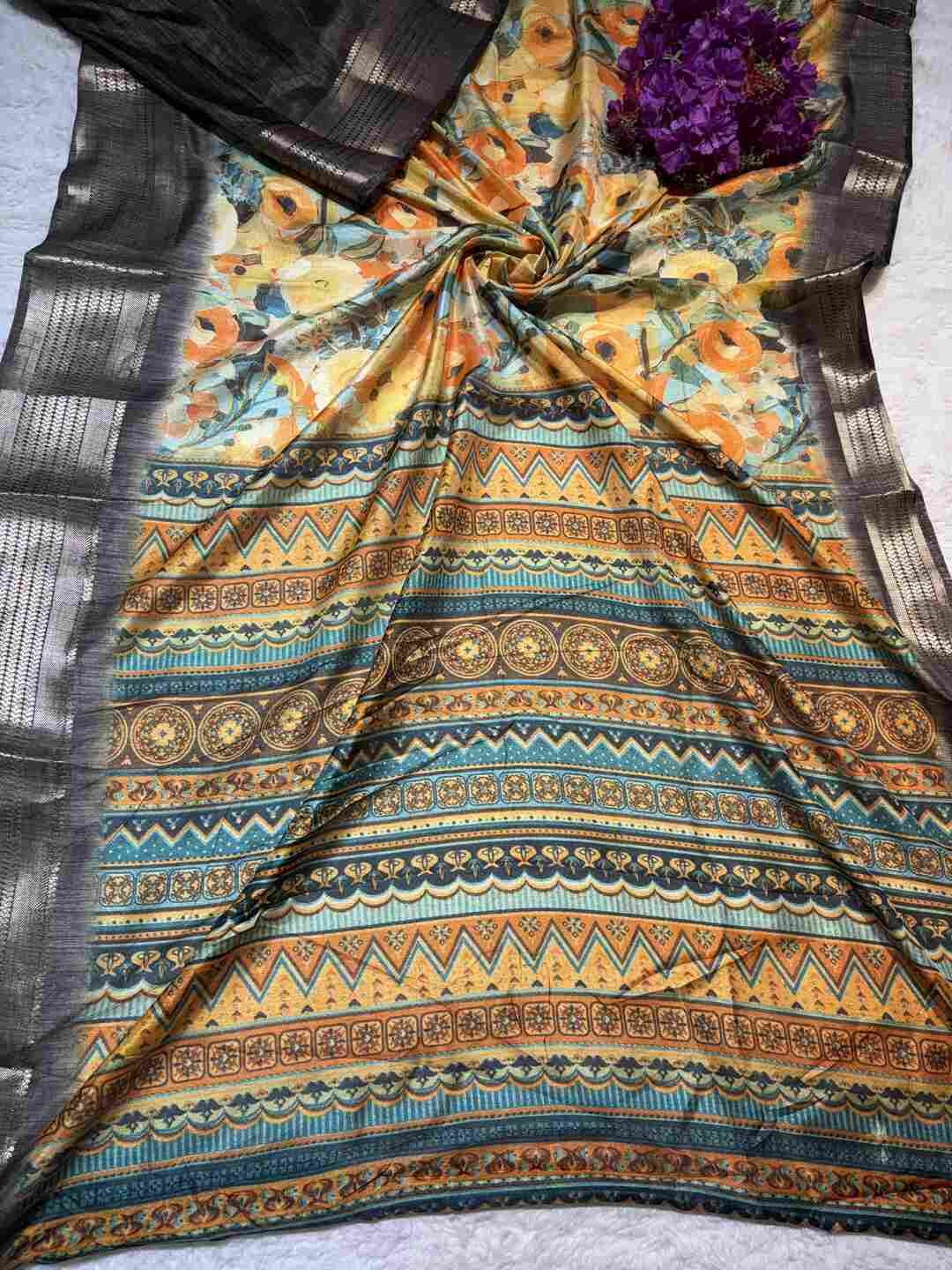 A stunning fusion of artistry: Vibrant digital prints come alive on soft Silk fabric, beautifully finished with an all-over Zari border, creating a rich, graceful drape that feels modern, festive, and effortlessly luxurious.