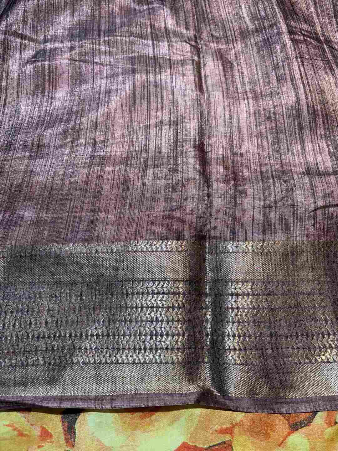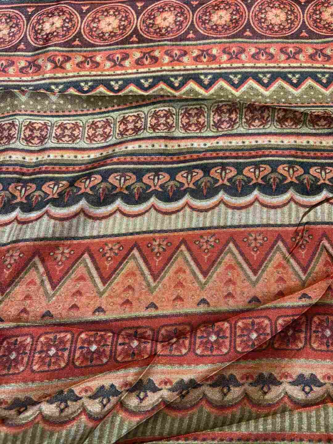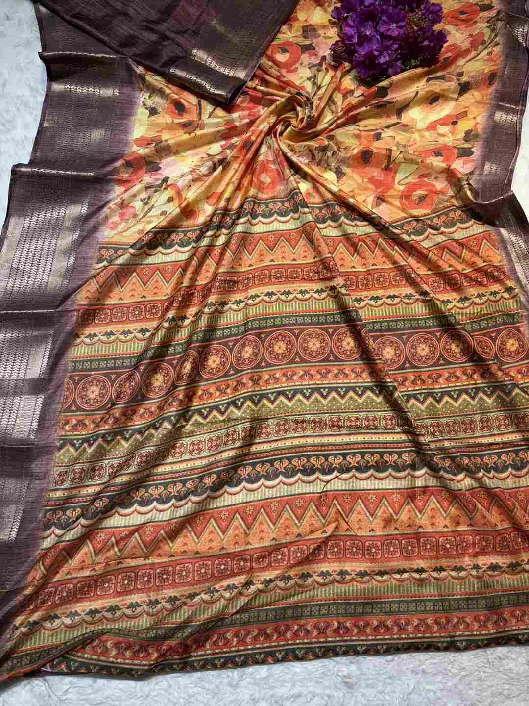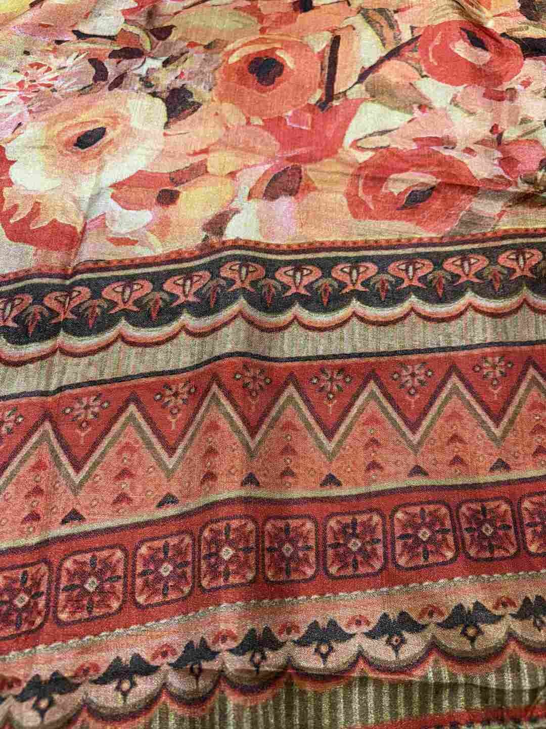 A stunning fusion of artistry: Vibrant digital prints come alive on soft Silk fabric, beautifully finished with an all-over Zari border, creating a rich, graceful drape that feels modern, festive, and effortlessly luxurious.