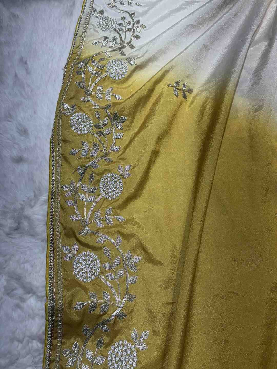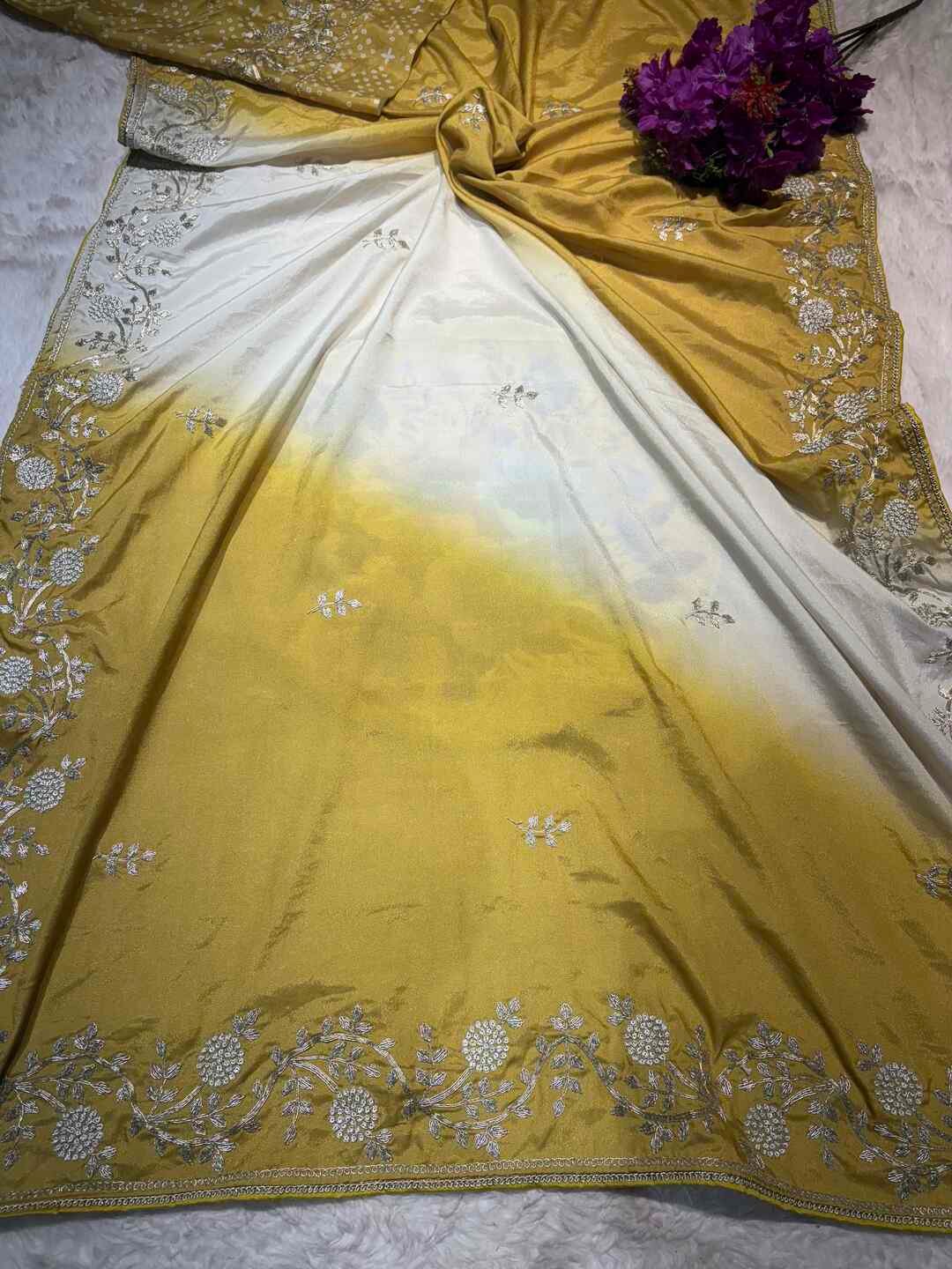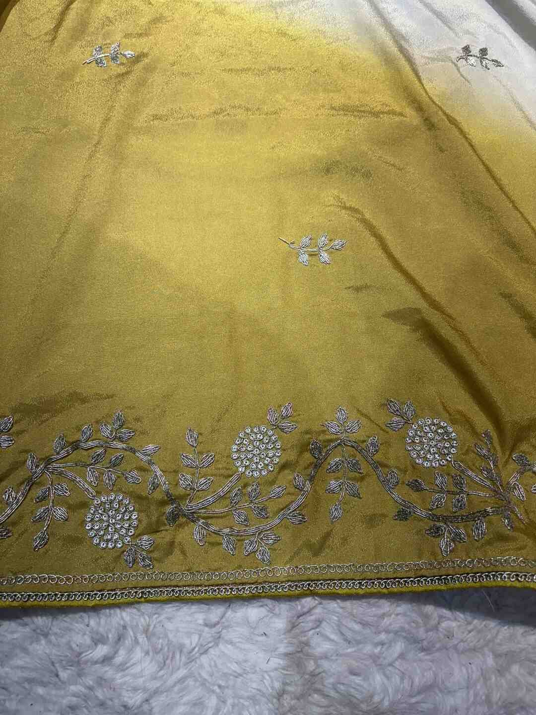The combination of double dye artistry and Maroda work makes the saree truly royal and unique.