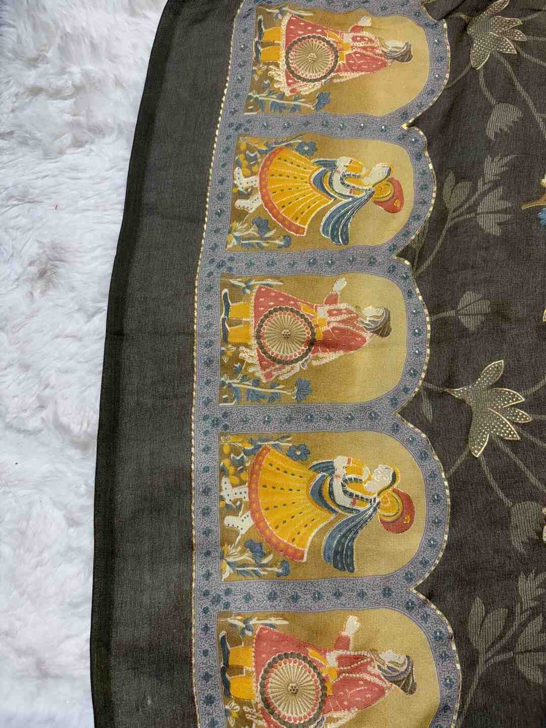 A stunning fusion of artistry: Contemporary figure digital prints come alive on soft Georgette fabric, creating a lightweight, flowy drape that feels modern, stylish, and effortlessly elegant.