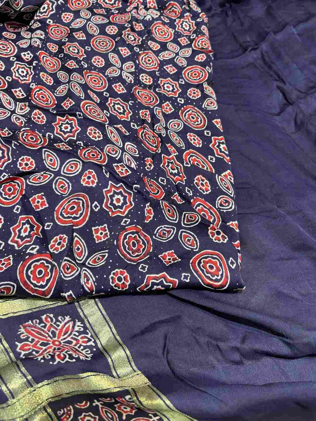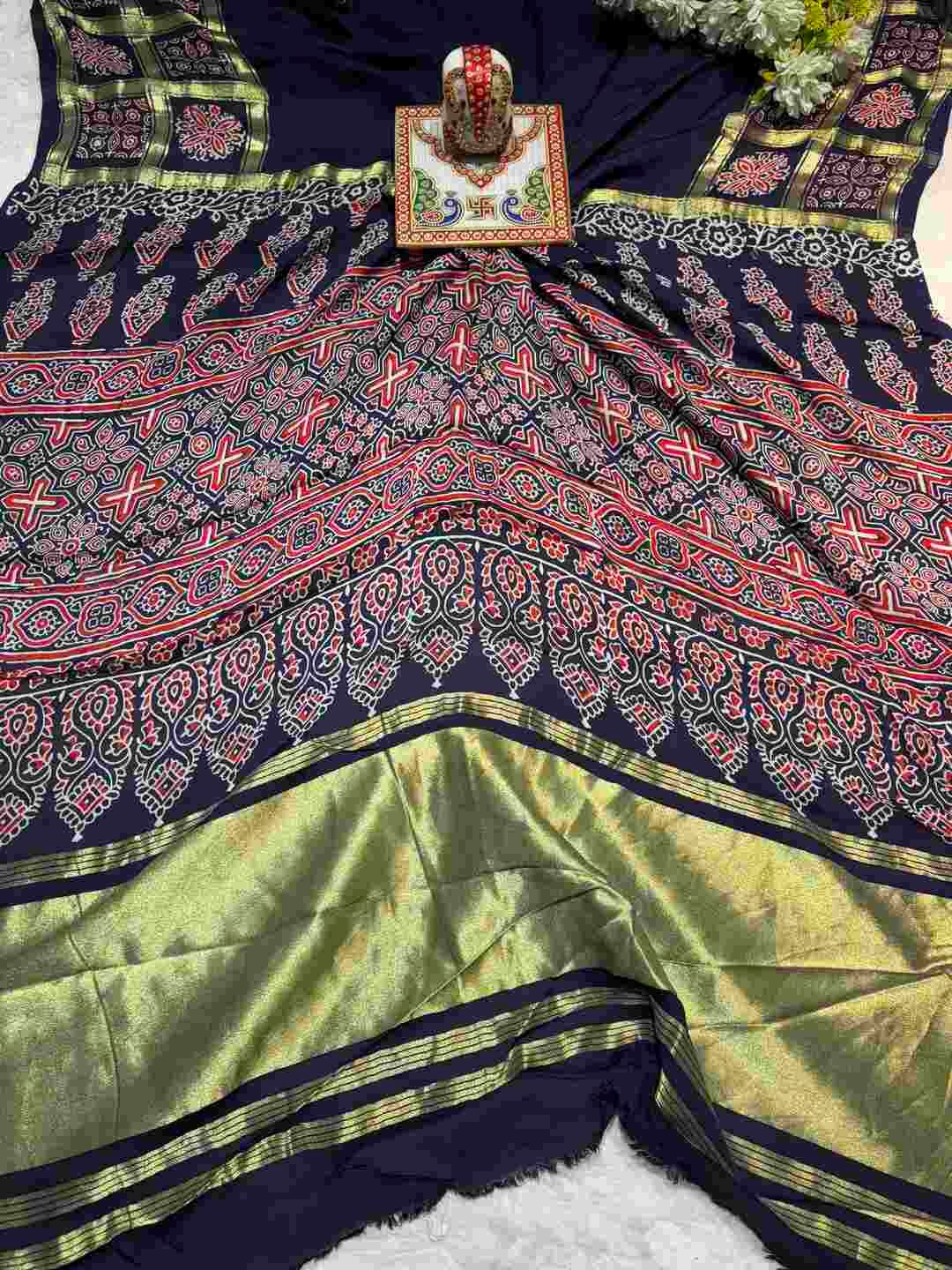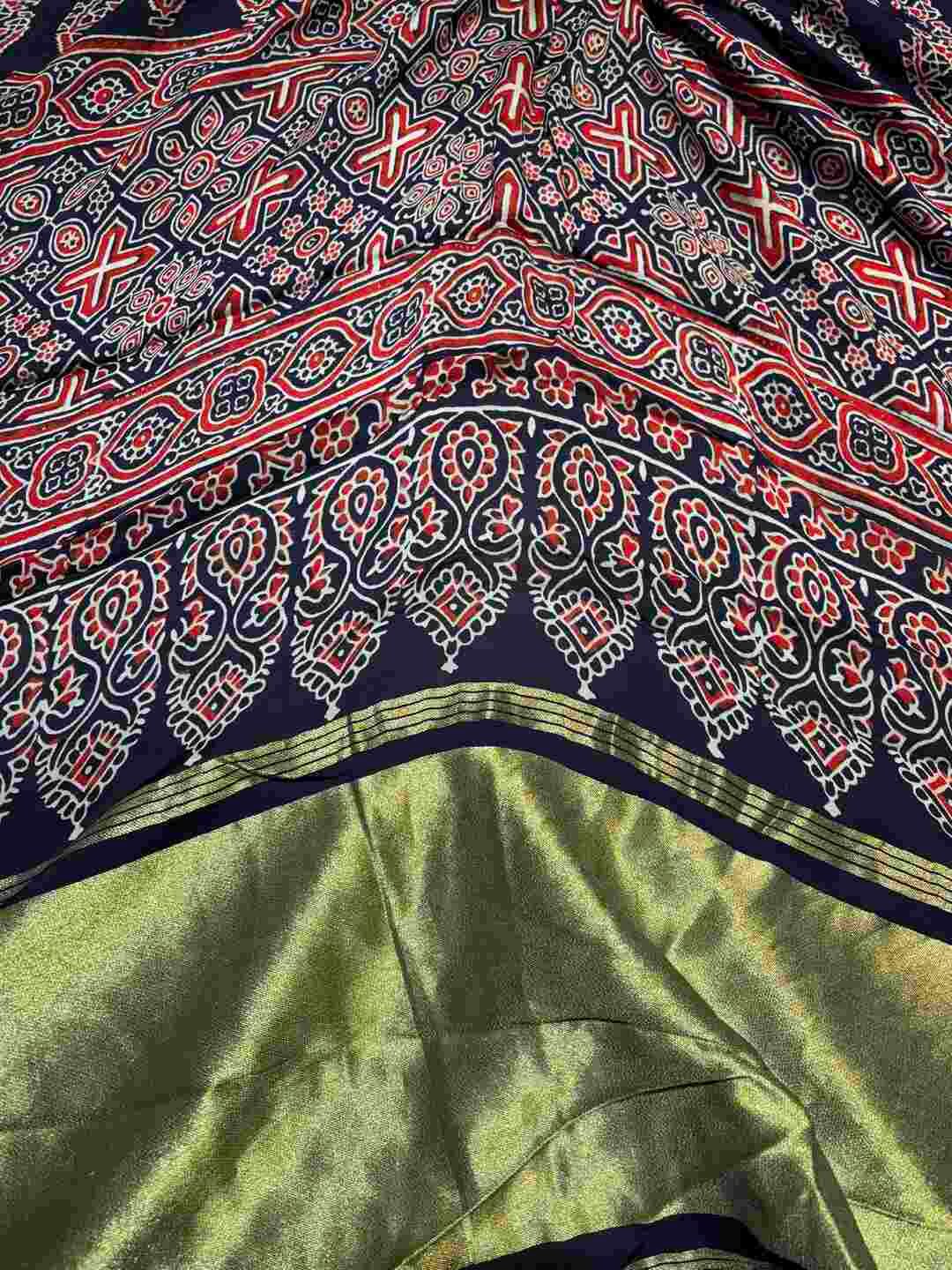 A stunning fusion of artistry: The auspicious Ghatchola pattern is beautifully blended with rich Ajrak print, creating a culturally inspired drape that feels traditional, vibrant, and effortlessly elegant.