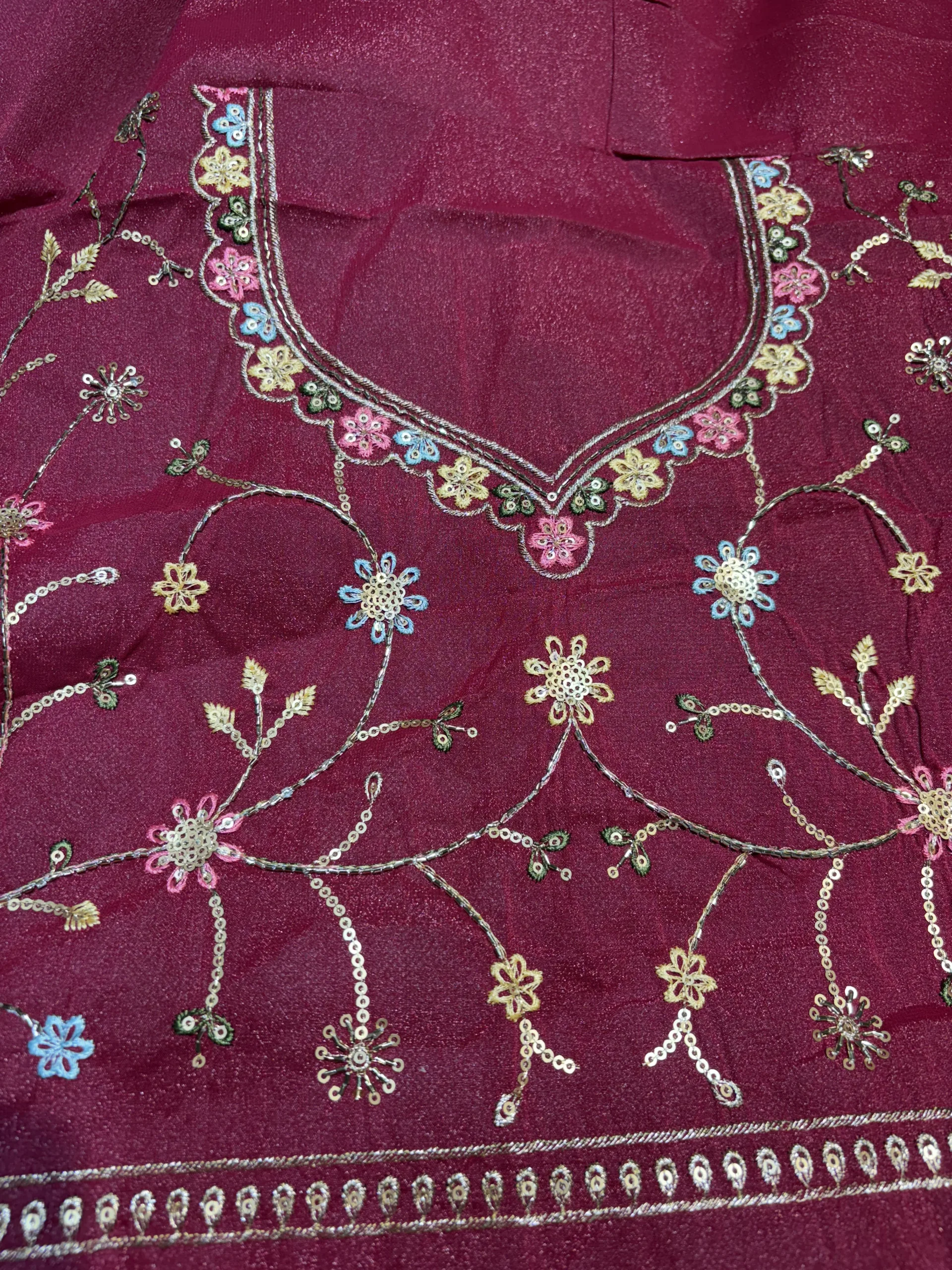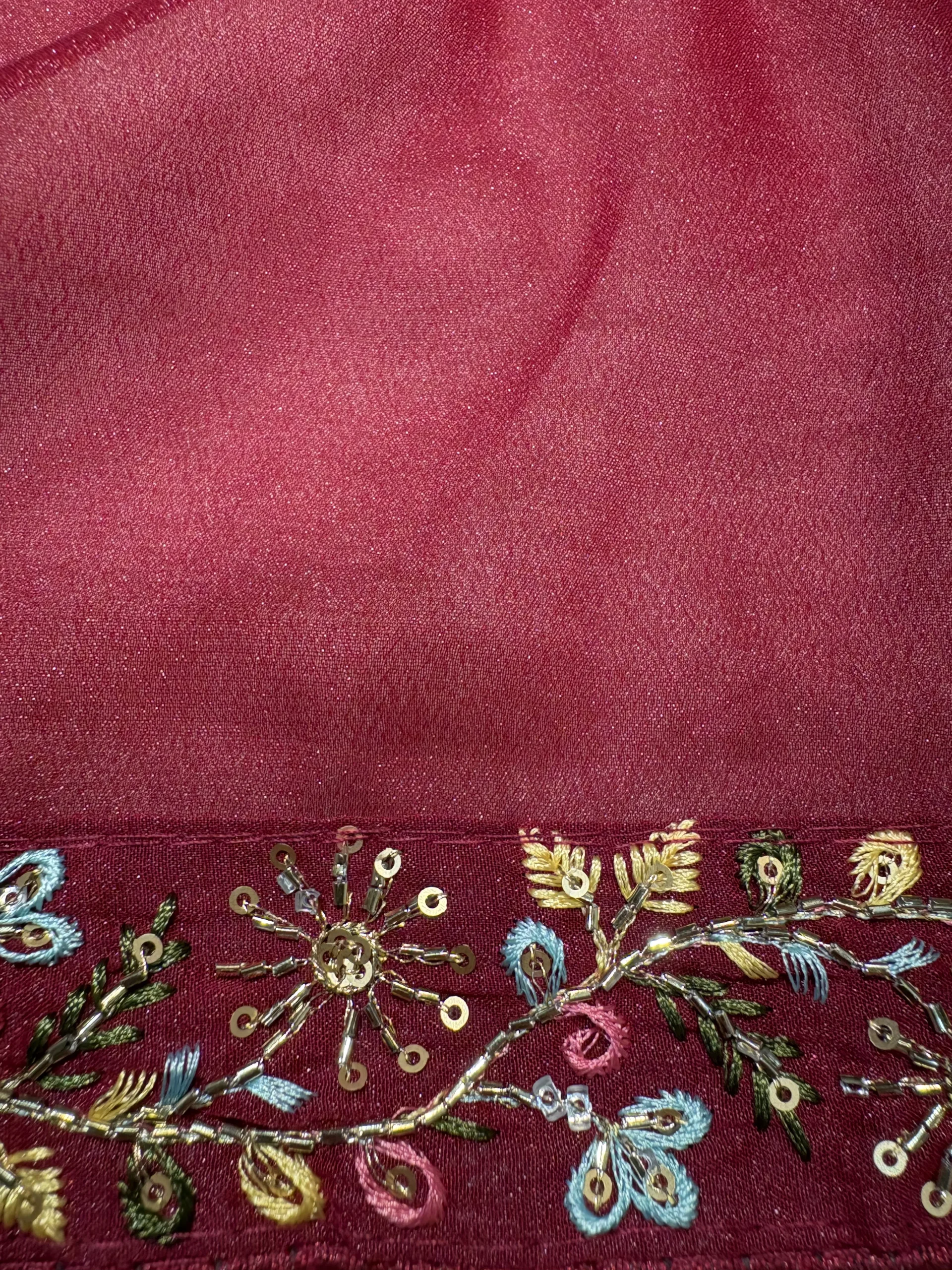 Due to the heavy work on the blouse and the delicate nature of the saree fabric, it is recommended to Dry Clean Only. Handle the blouse with care, avoiding direct ironing over the embellished areas.