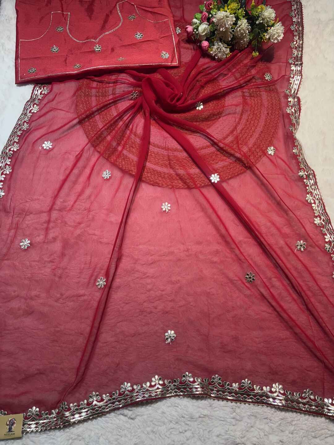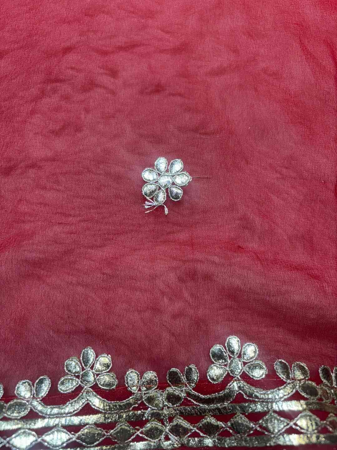 A stunning fusion of artistry: Soft, flowy fabric is beautifully accentuated with elegant Gota Patti work, creating a festive, graceful drape that feels traditional, radiant, and effortlessly luxurious.