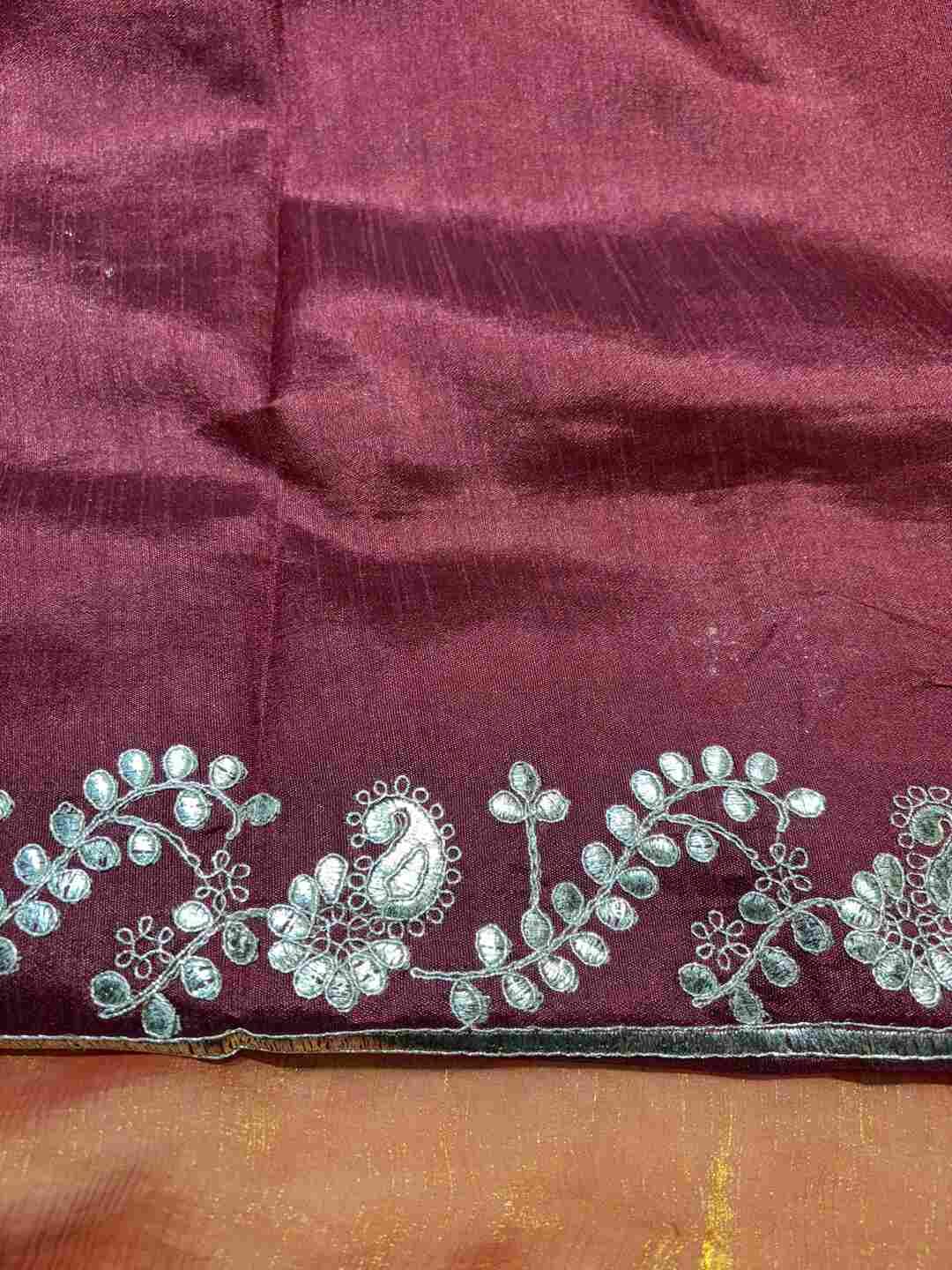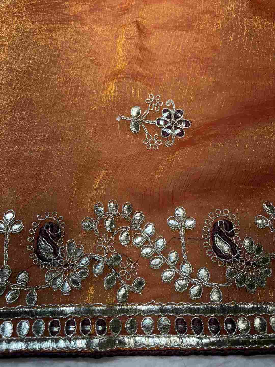 A stunning fusion of artistry: Rich Fandy Silk is beautifully adorned with intricate Gota Patti work, creating a festive, elegant drape that feels traditional, radiant, and effortlessly luxurious.