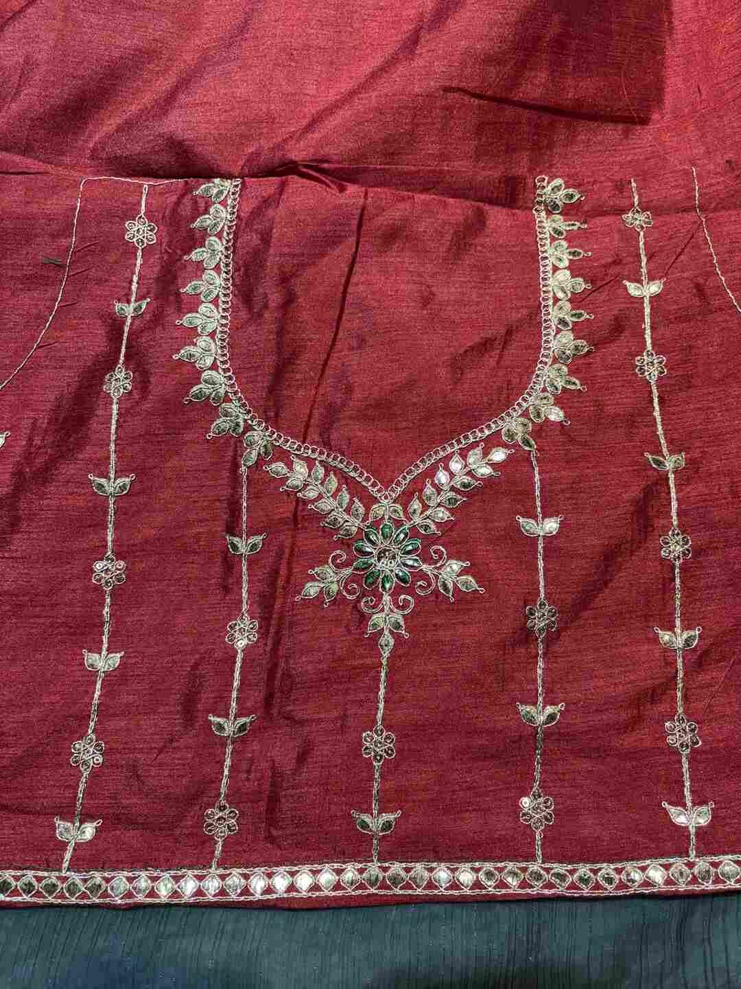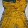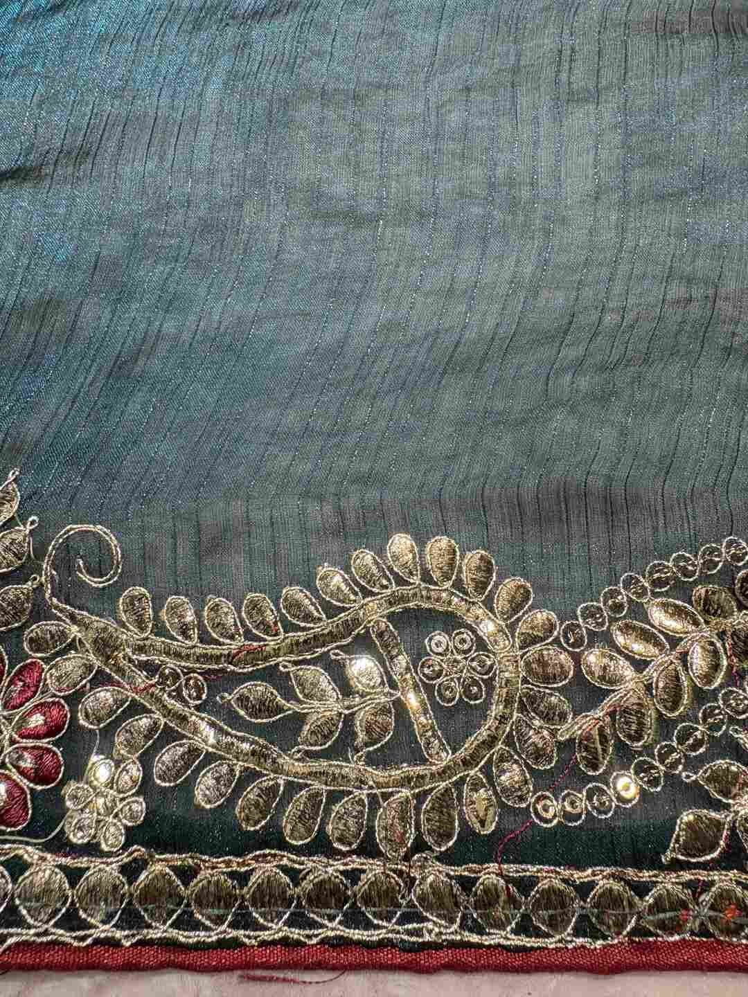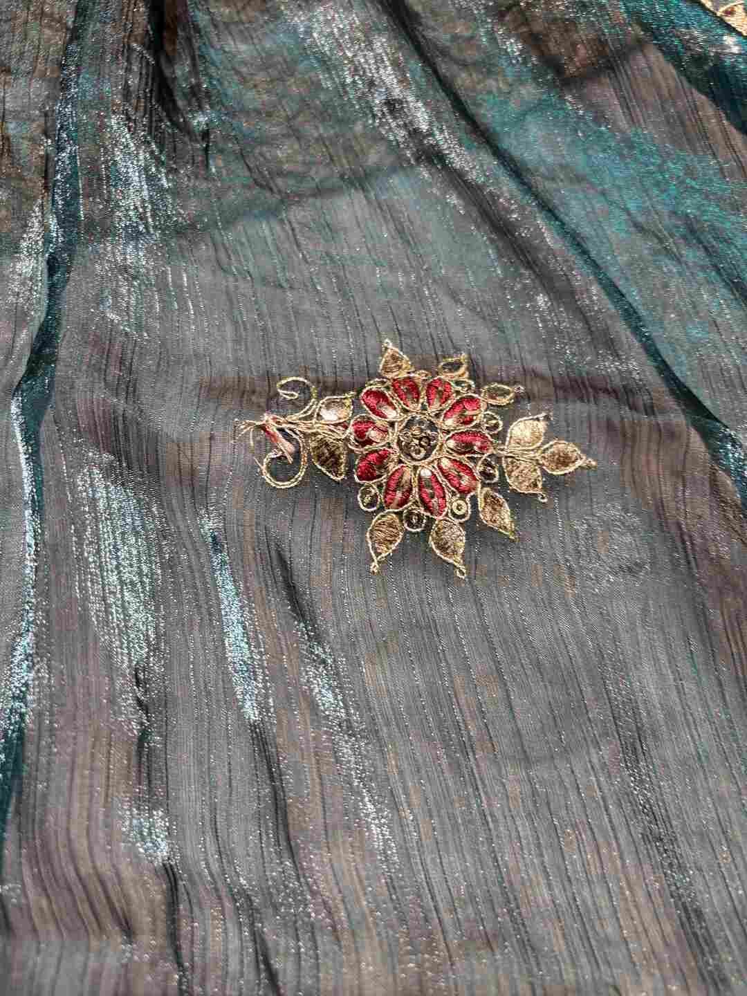 A stunning fusion of artistry: Elegant Gota Patti work adorns rich Fandy Silk fabric, creating a festive, refined drape that feels traditional, radiant, and effortlessly luxurious.
