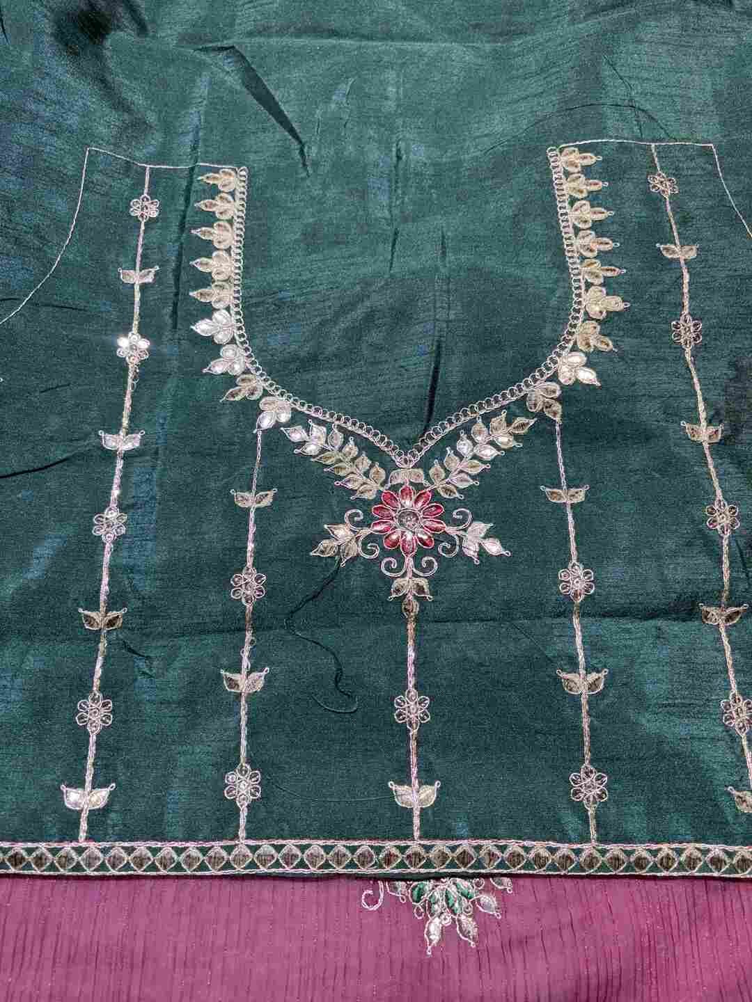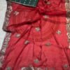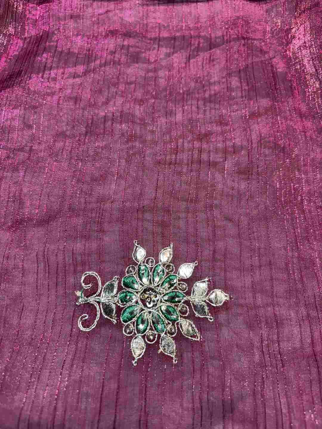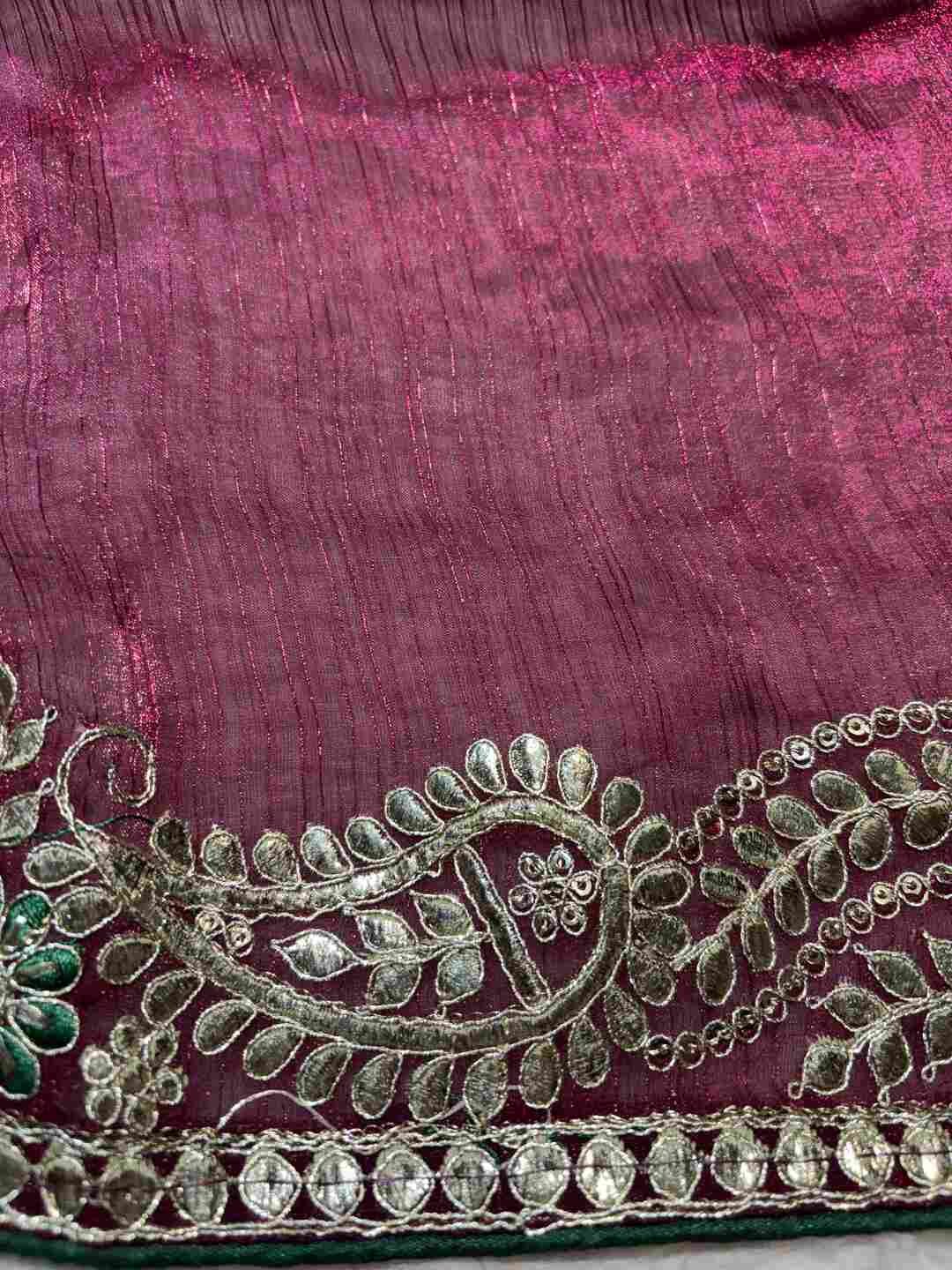 A stunning fusion of artistry: Elegant Gota Patti work adorns rich Fandy Silk fabric, creating a festive, refined drape that feels traditional, radiant, and effortlessly luxurious.