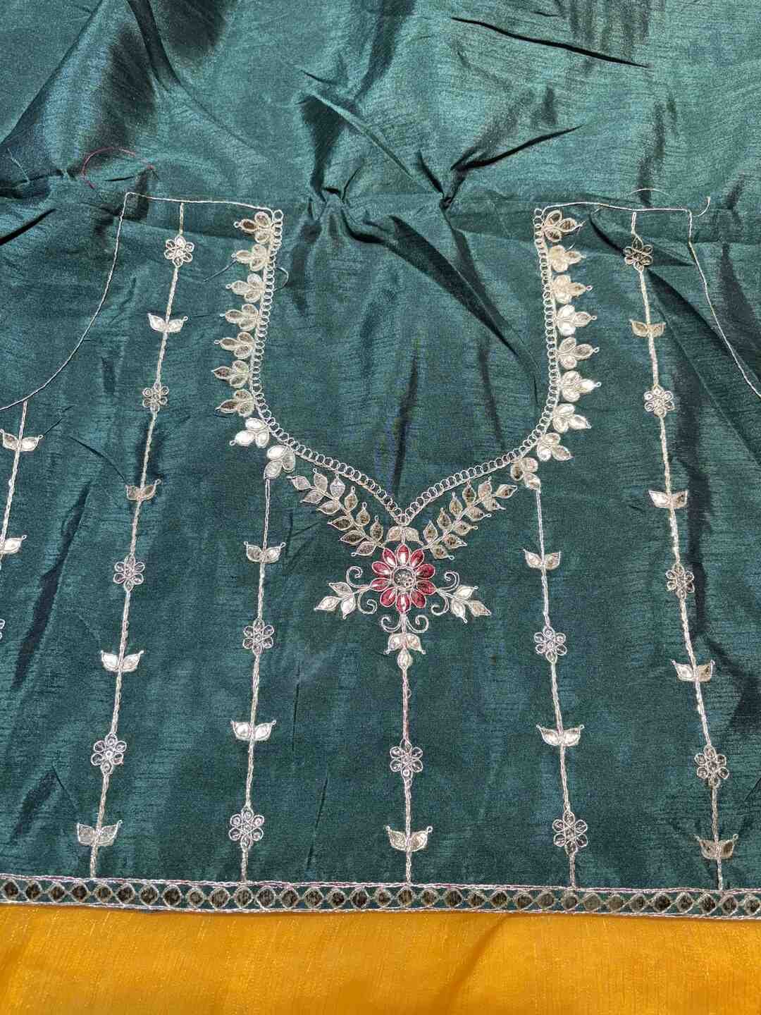 A stunning fusion of artistry: Elegant Gota Patti work adorns rich Fandy Silk fabric, creating a festive, refined drape that feels traditional, radiant, and effortlessly luxurious.
