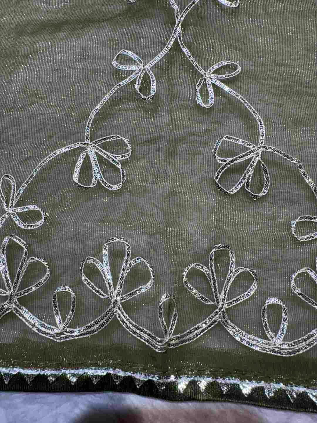 A stunning fusion of artistry: Delicate Gota Patti work enhances the soft, flowy Chiffon fabric, creating a lightweight, graceful drape that feels festive, elegant, and effortlessly luxurious.
