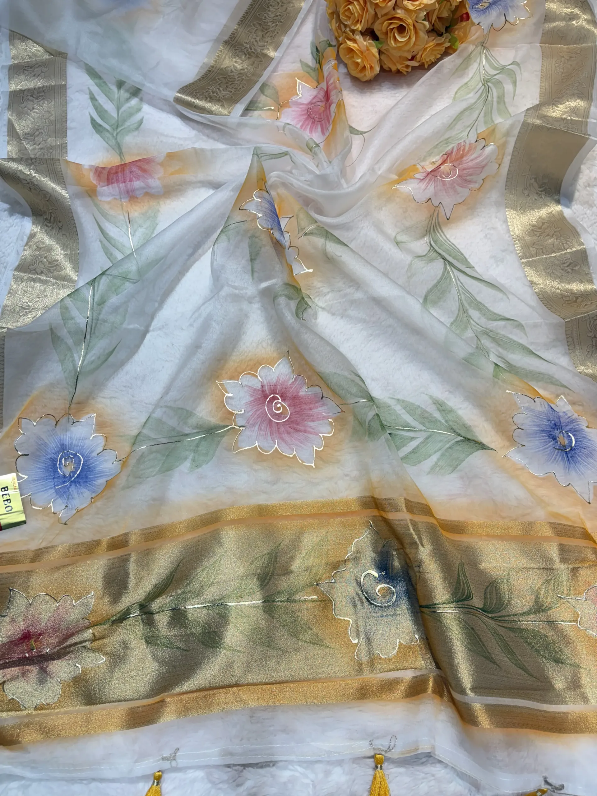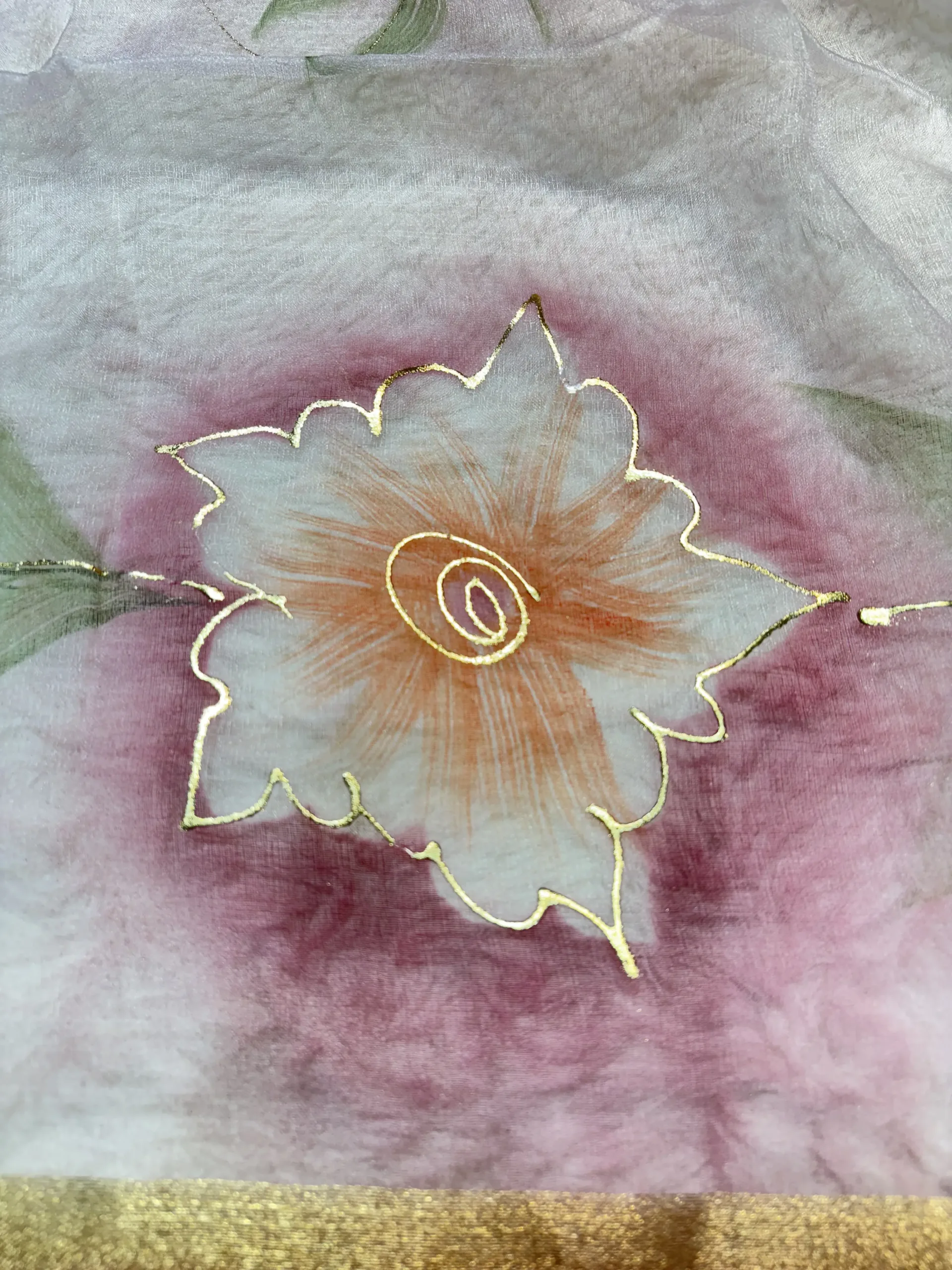 Each piece is unique due to the handpainting process, making it a truly one-of-a-kind saree.