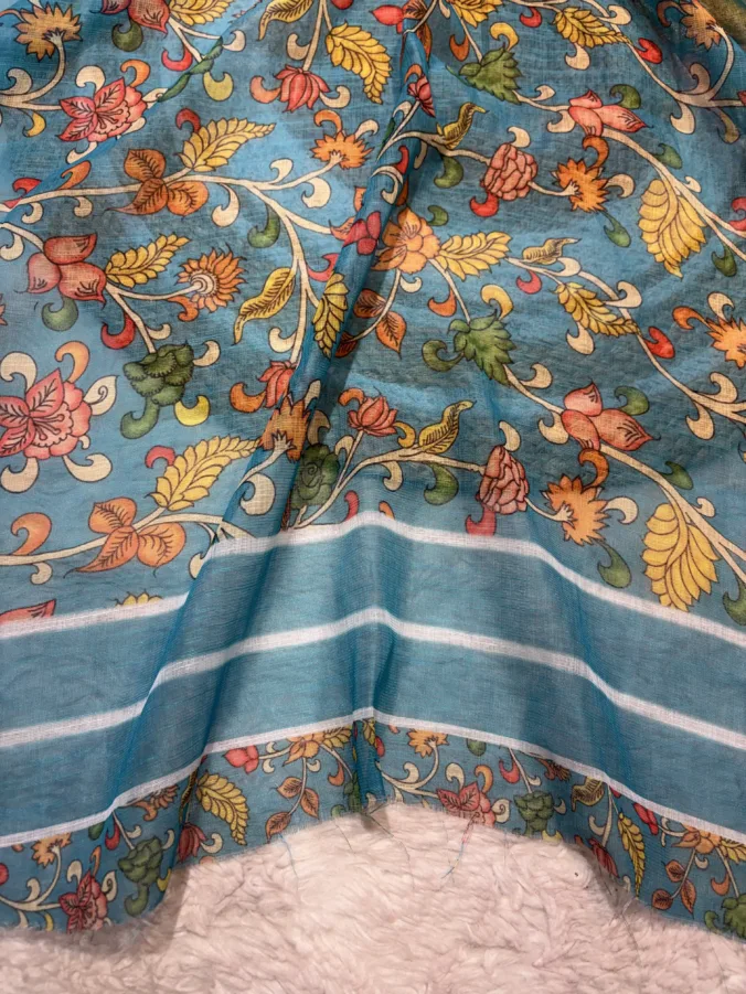 The saree celebrates the intricate art of Kalamkari, or ‘pen-work’, featuring motifs drawn from mythological tales, temple art, and scenes from nature (such as detailed florals, vines, and traditional figures). The print work utilizes the classic Kalamkari palette, typically composed of natural dyes that lend a subtle, sophisticated, and earthy finish to the entire fabric.