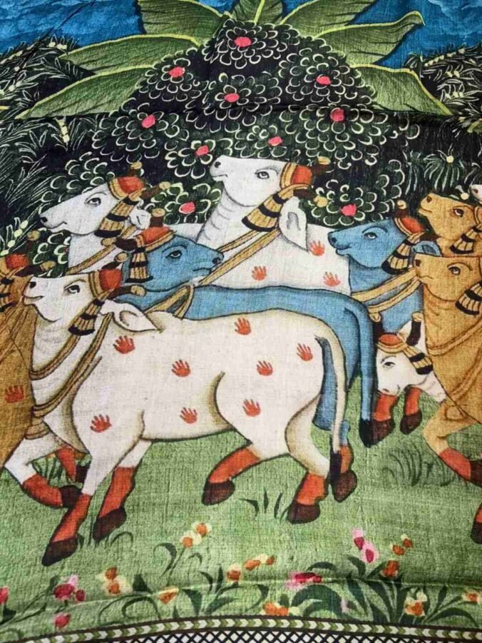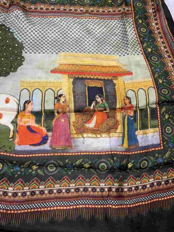A stunning fusion of artistry: Exquisite hand-painted motifs bloom gracefully on soft Tissue fabric, offering a lightweight, shimmering drape that feels uniquely artistic, modern, and luxuriously elegant.