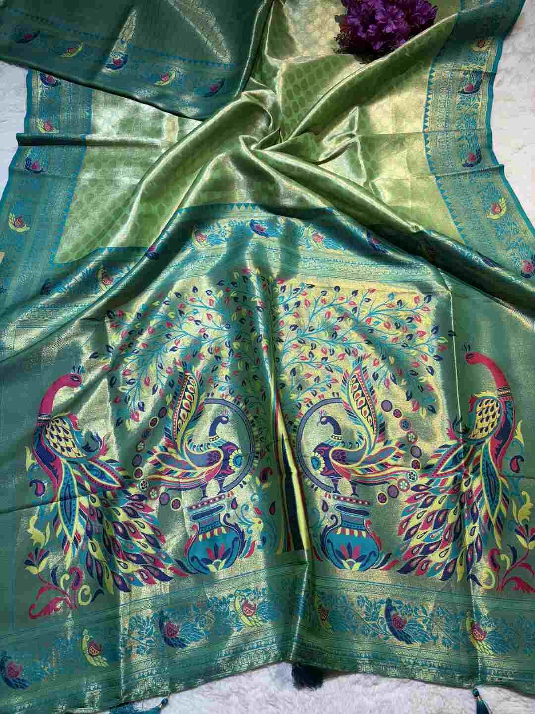 A stunning fusion of artistry: Exquisite hand-painted motifs bloom gracefully on soft Tissue fabric, offering a lightweight, shimmering drape that feels uniquely artistic, modern, and luxuriously elegant.