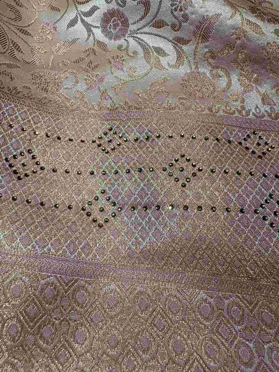 A stunning fusion of artistry: Exquisite hand-painted motifs bloom gracefully on soft Tissue fabric, offering a lightweight, shimmering drape that feels uniquely artistic, modern, and luxuriously elegant.