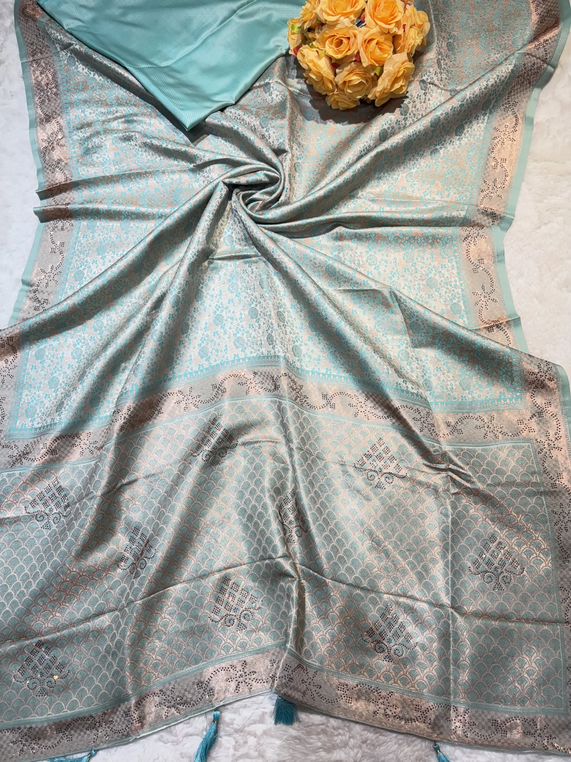 The fusion of zari weaving and diamond sparkle makes this saree a true statement piece.