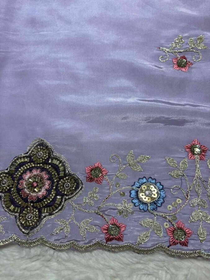 This saree features intricate Kasida Work, known for its fine embroidery and traditional appeal.