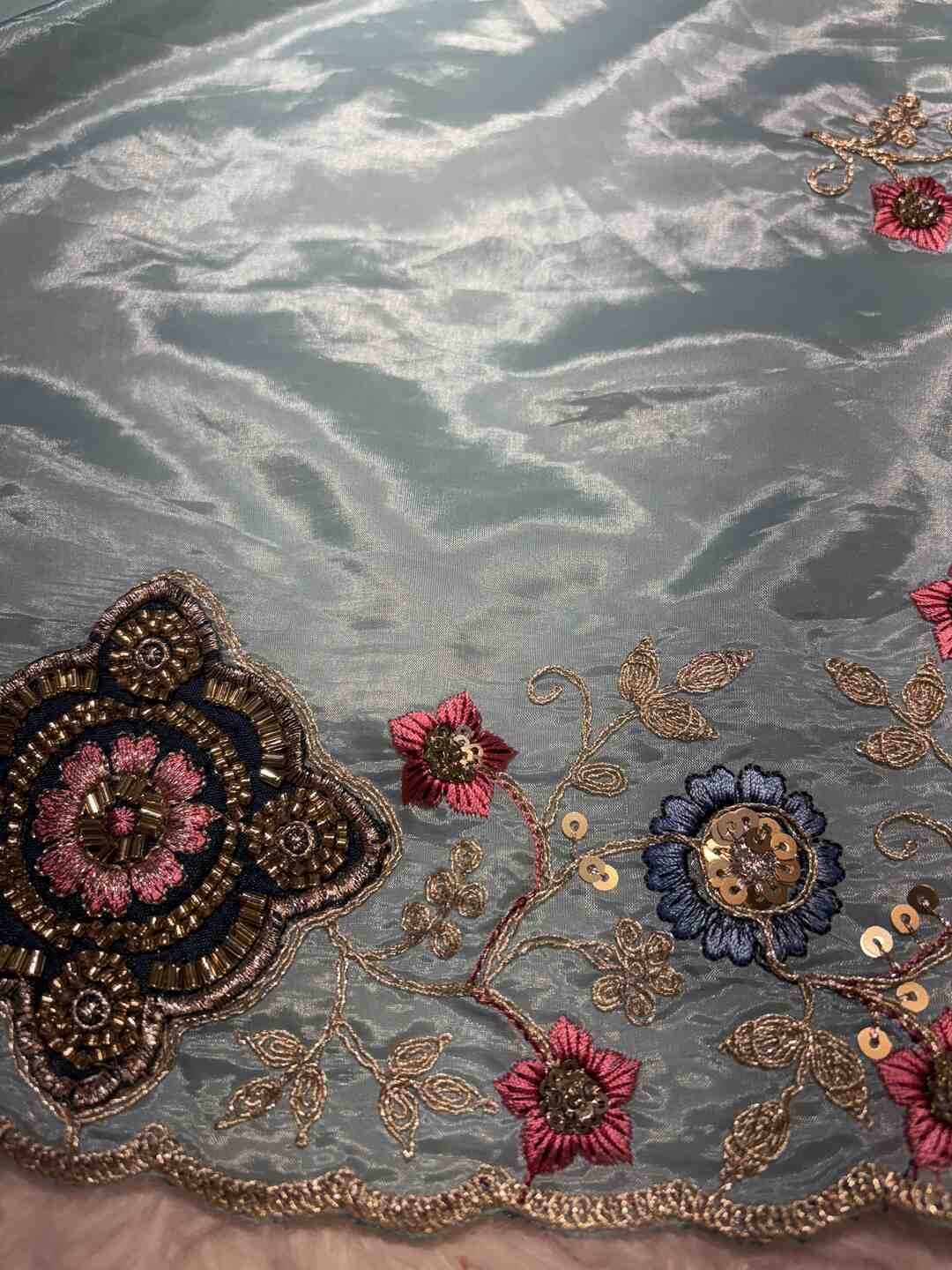 A stunning fusion of artistry: Intricate Kasida work enhances the richness of H.O Silk fabric, creating a graceful, festive drape that feels traditional, elegant, and effortlessly luxurious.
