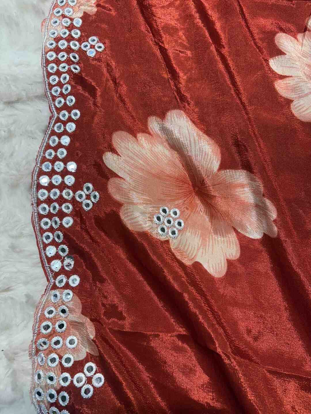A stunning fusion of artistry: Intricate Kasida work beautifully enhances the soft Chinon Silk fabric, creating a graceful, festive drape that feels traditional, refined, and effortlessly luxurious.