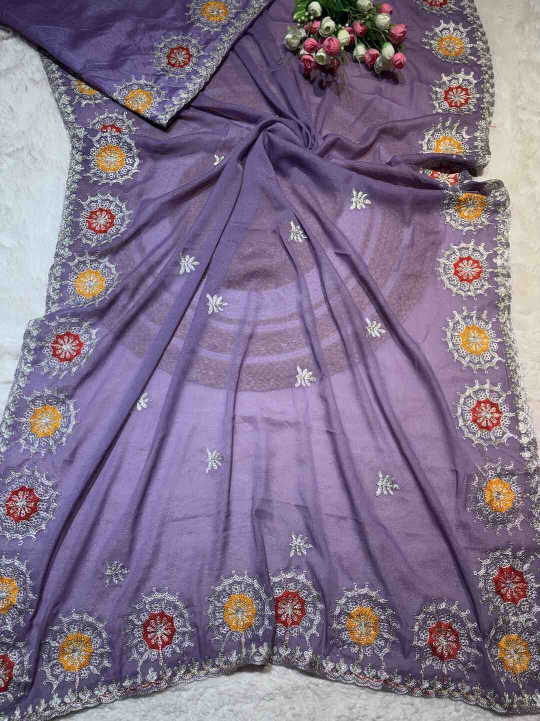 A stunning fusion of artistry: Intricate Kasida work highlighted with vibrant colour thread detailing enhances the soft Georgette fabric, creating a graceful, festive drape that feels elegant, expressive, and effortlessly luxurious.