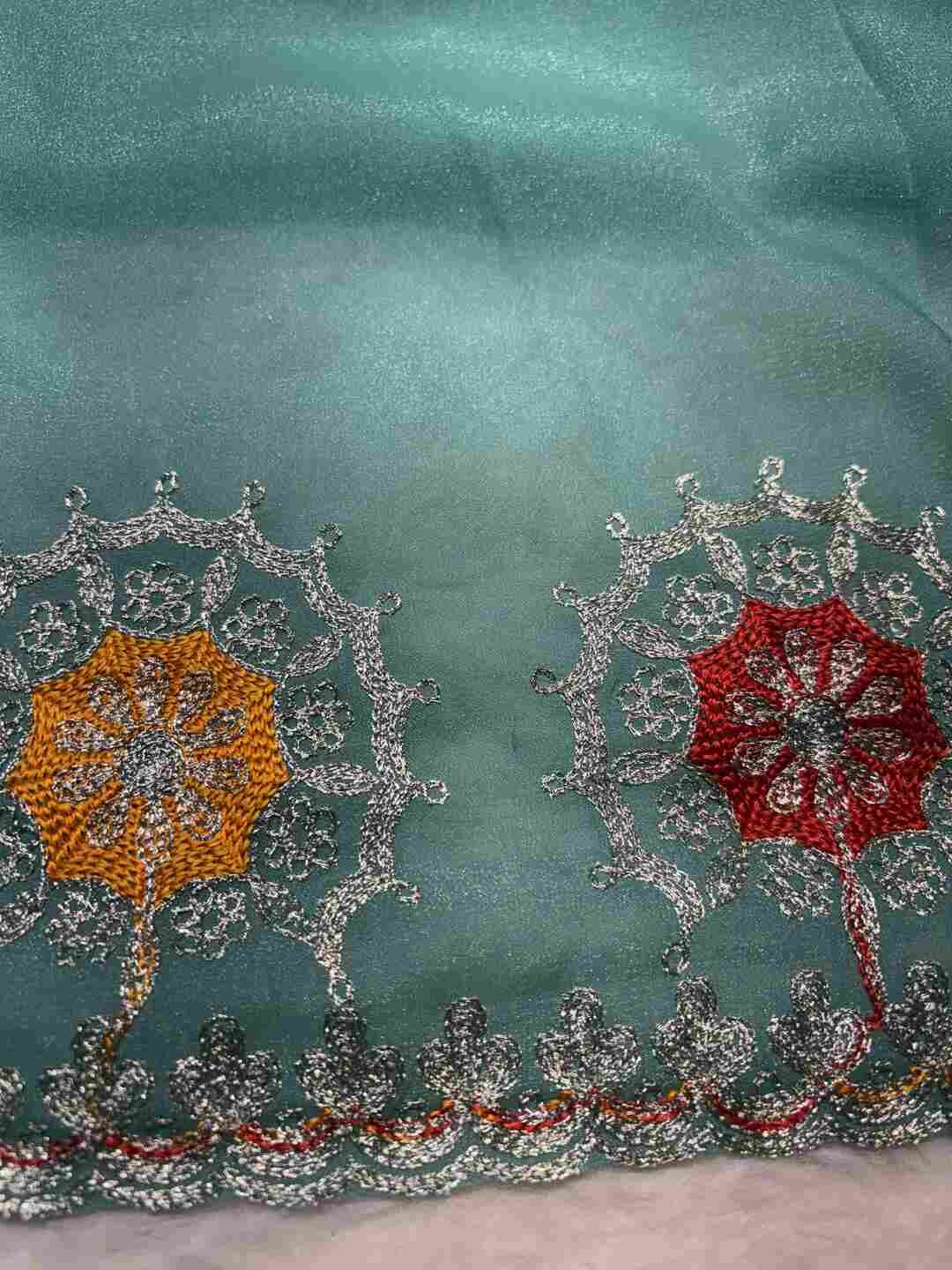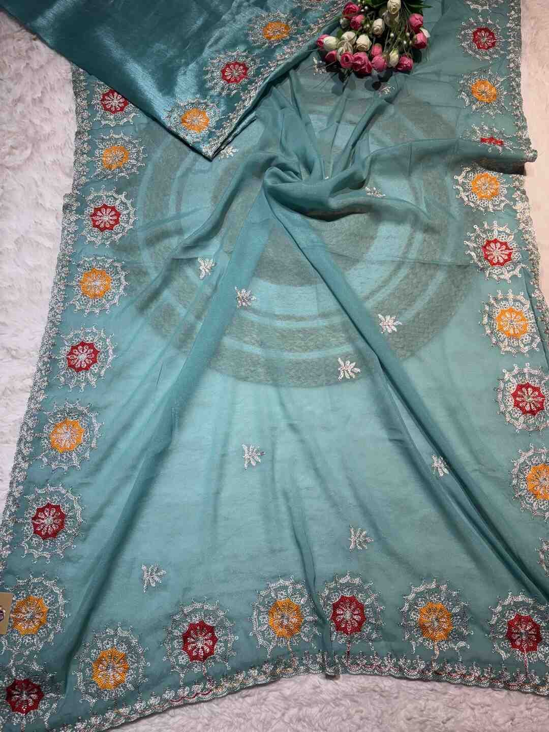 A stunning fusion of artistry: Intricate Kasida work highlighted with vibrant colour thread detailing enhances the soft Georgette fabric, creating a graceful, festive drape that feels elegant, expressive, and effortlessly luxurious.