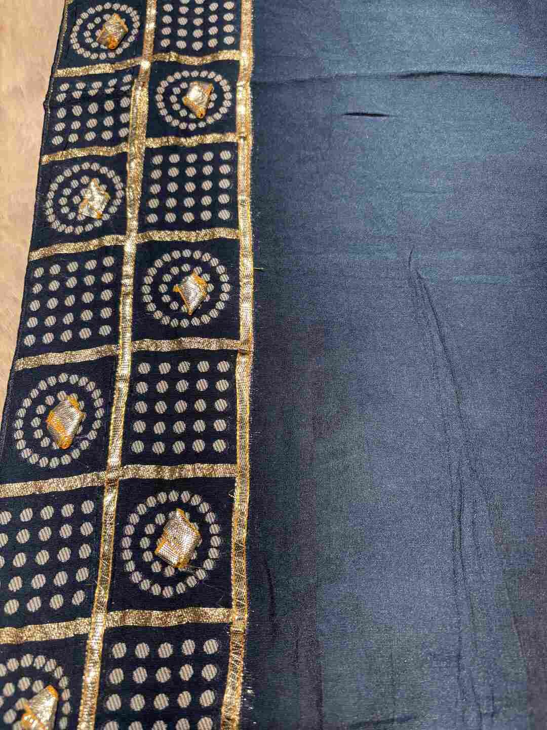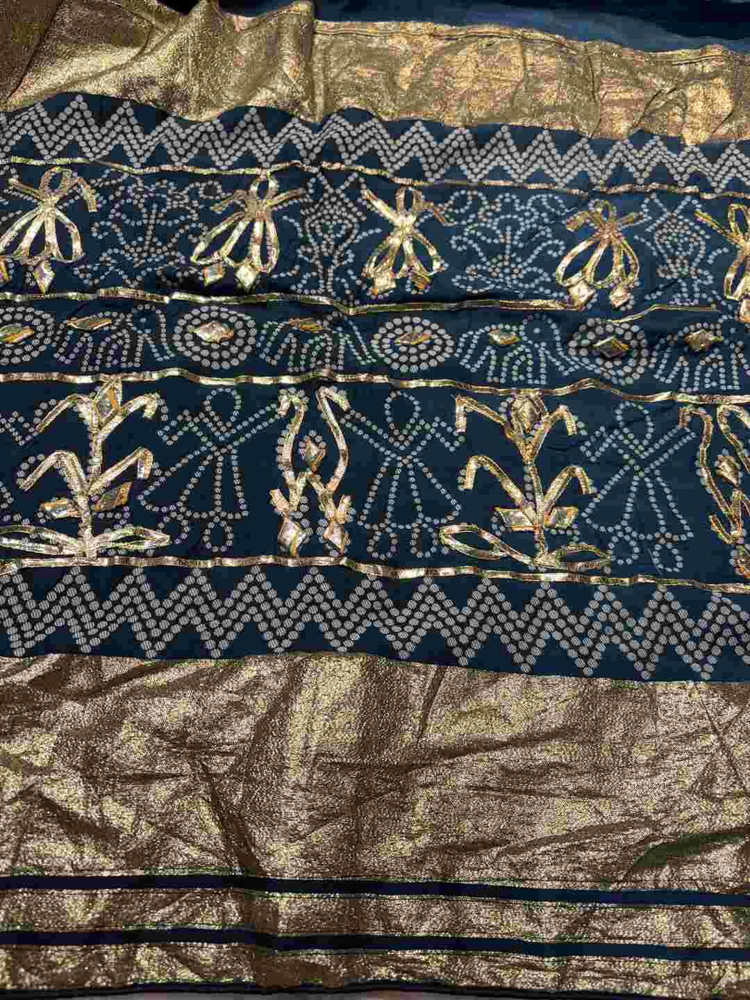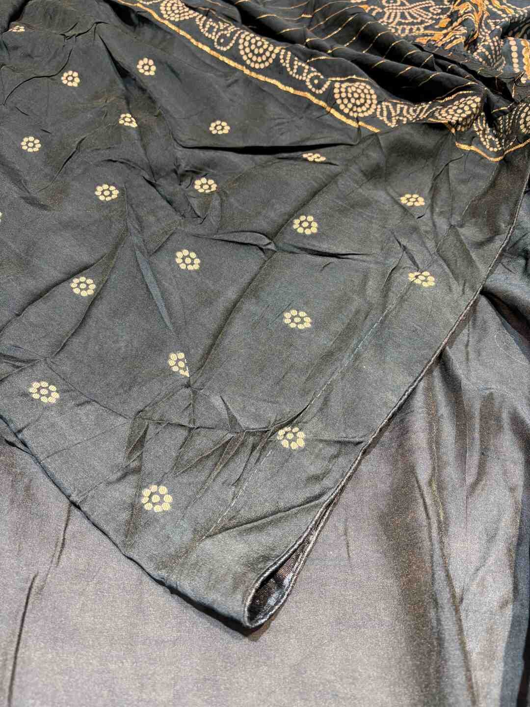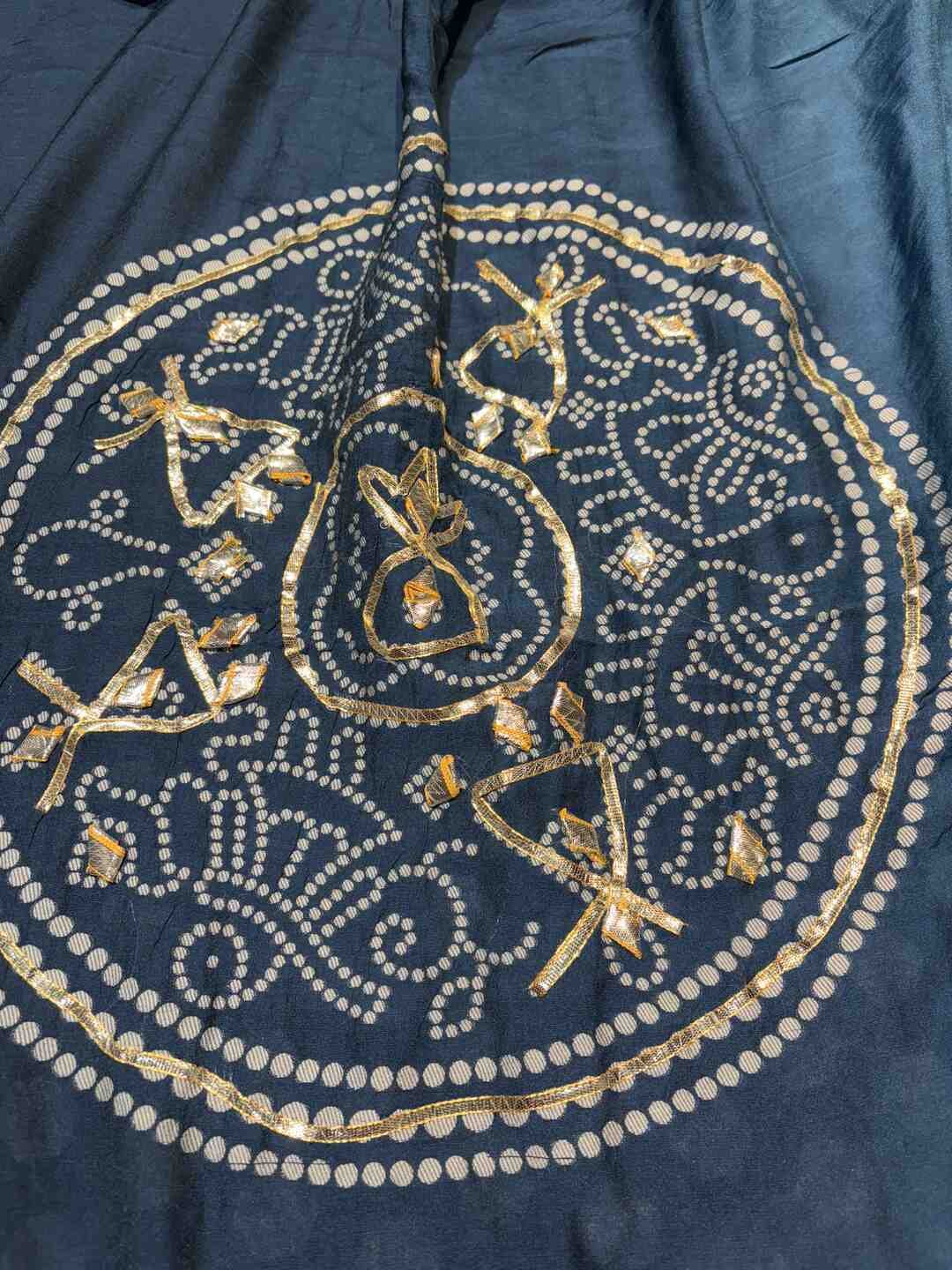 The fabric perfectly supports the intricate Bandhej and Ghatchola patterns.
