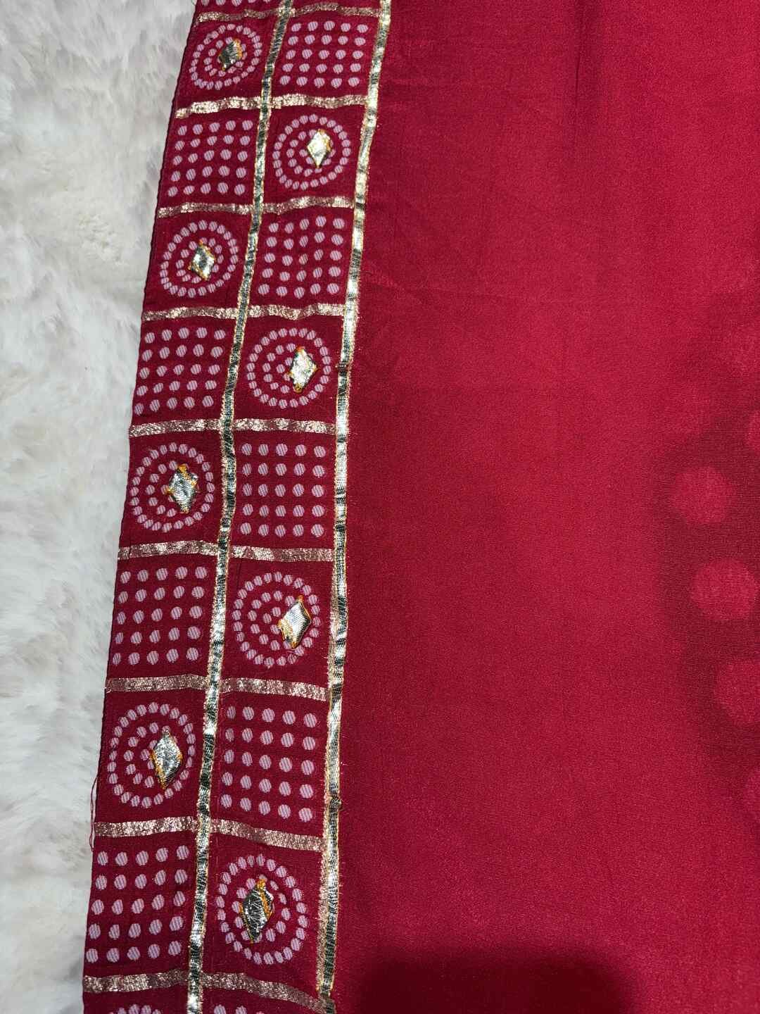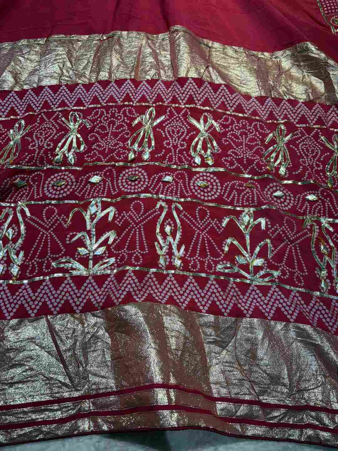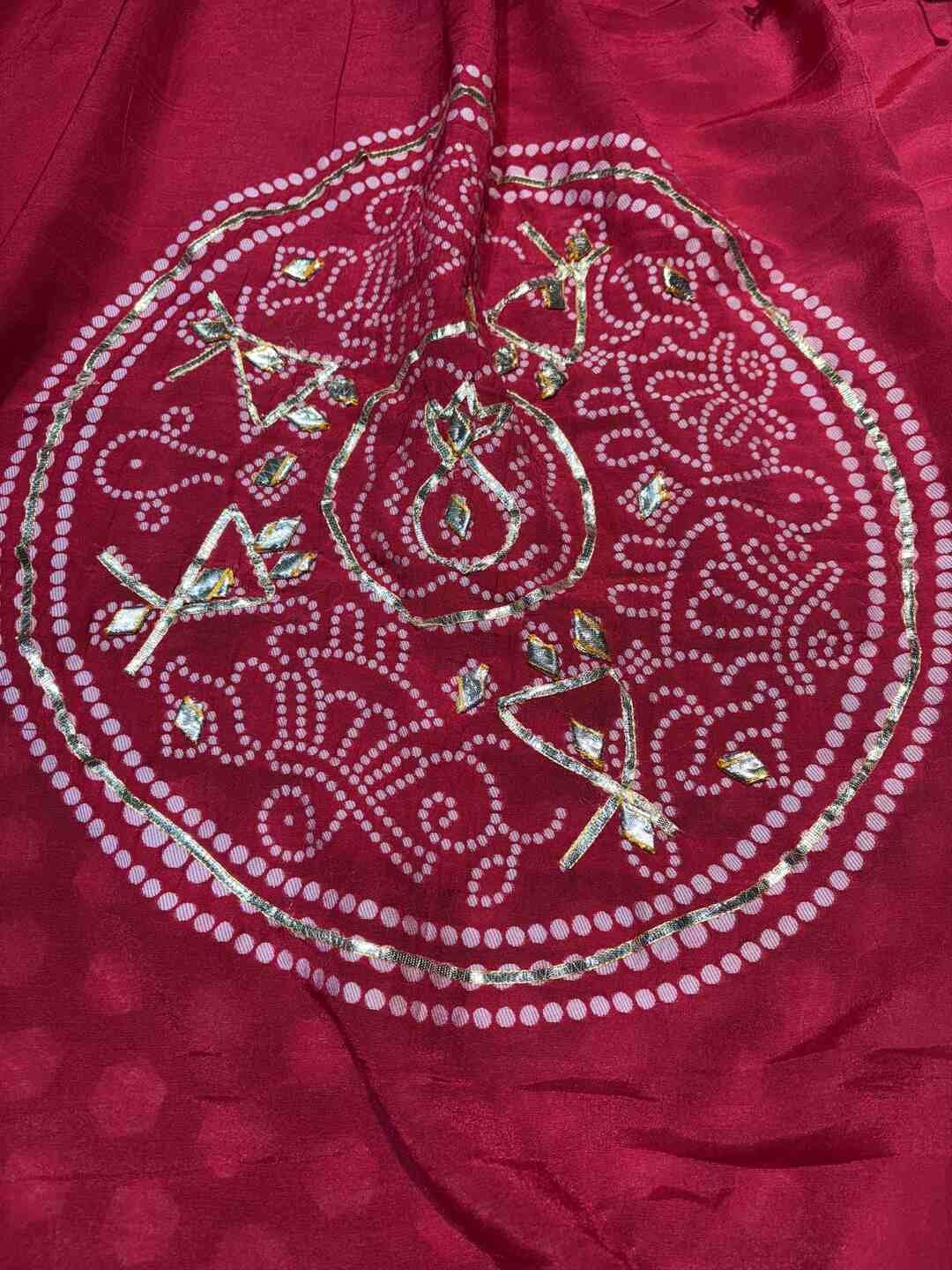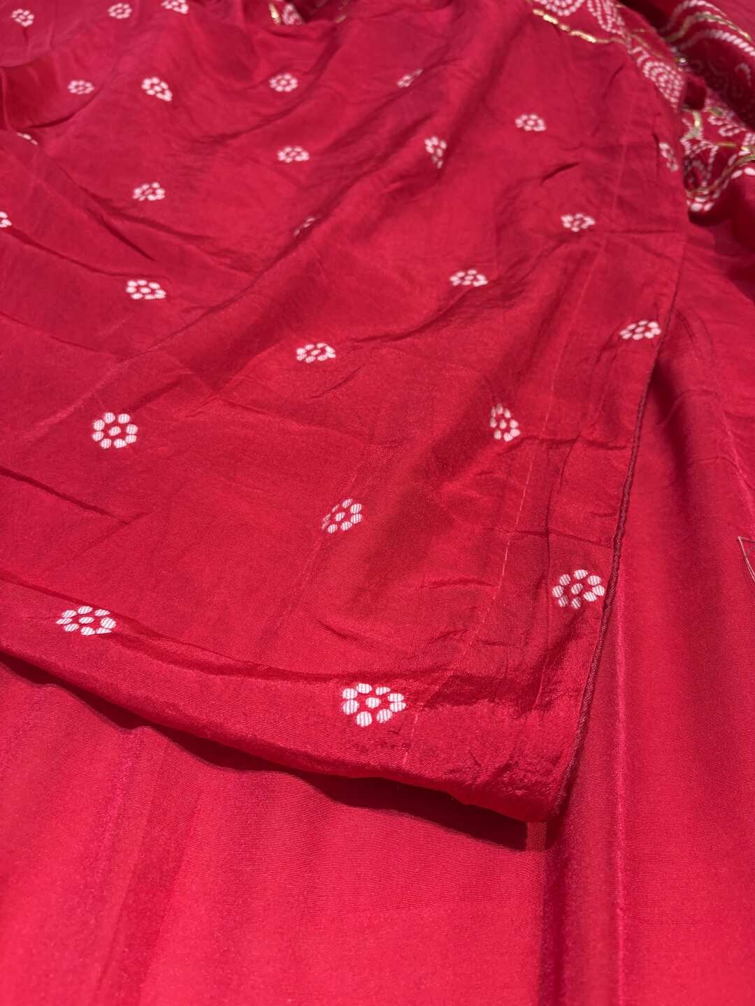 The fabric perfectly supports the intricate Bandhej and Ghatchola patterns.