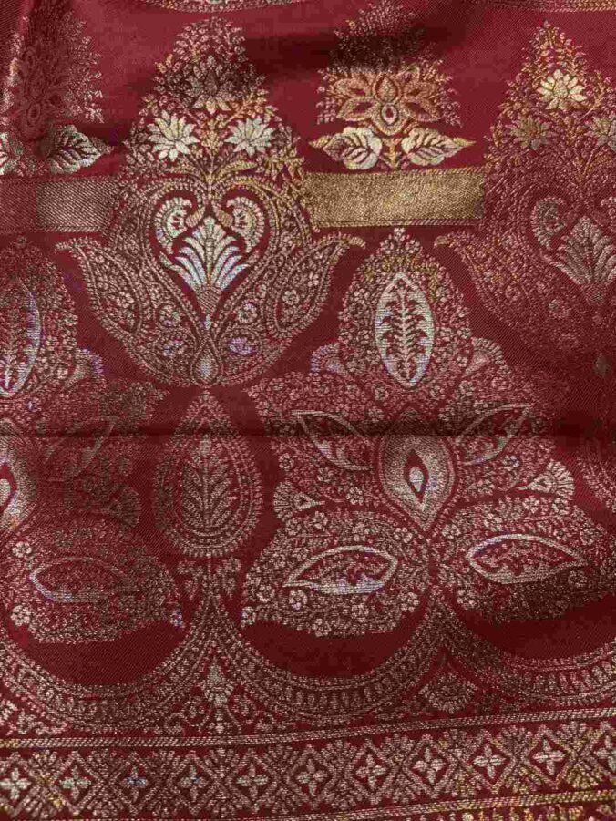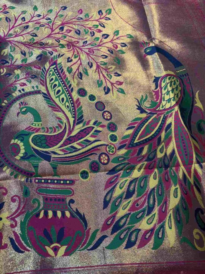 Traditional motifs like florals, paisleys, temples, peacocks, and storytelling patterns (design varies)