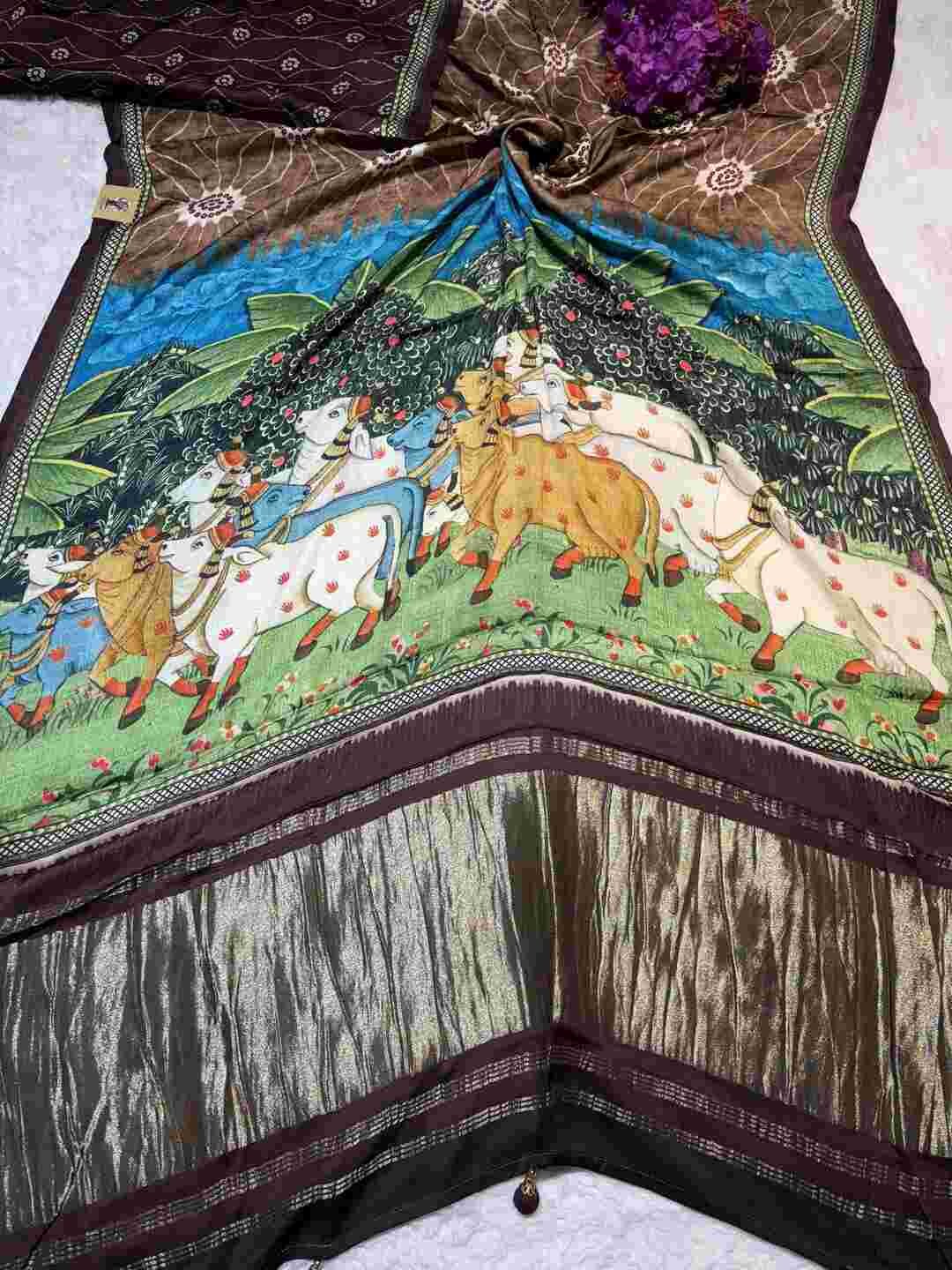 This saree features authentic Kalamkari-style print, inspired by ancient Indian art forms.