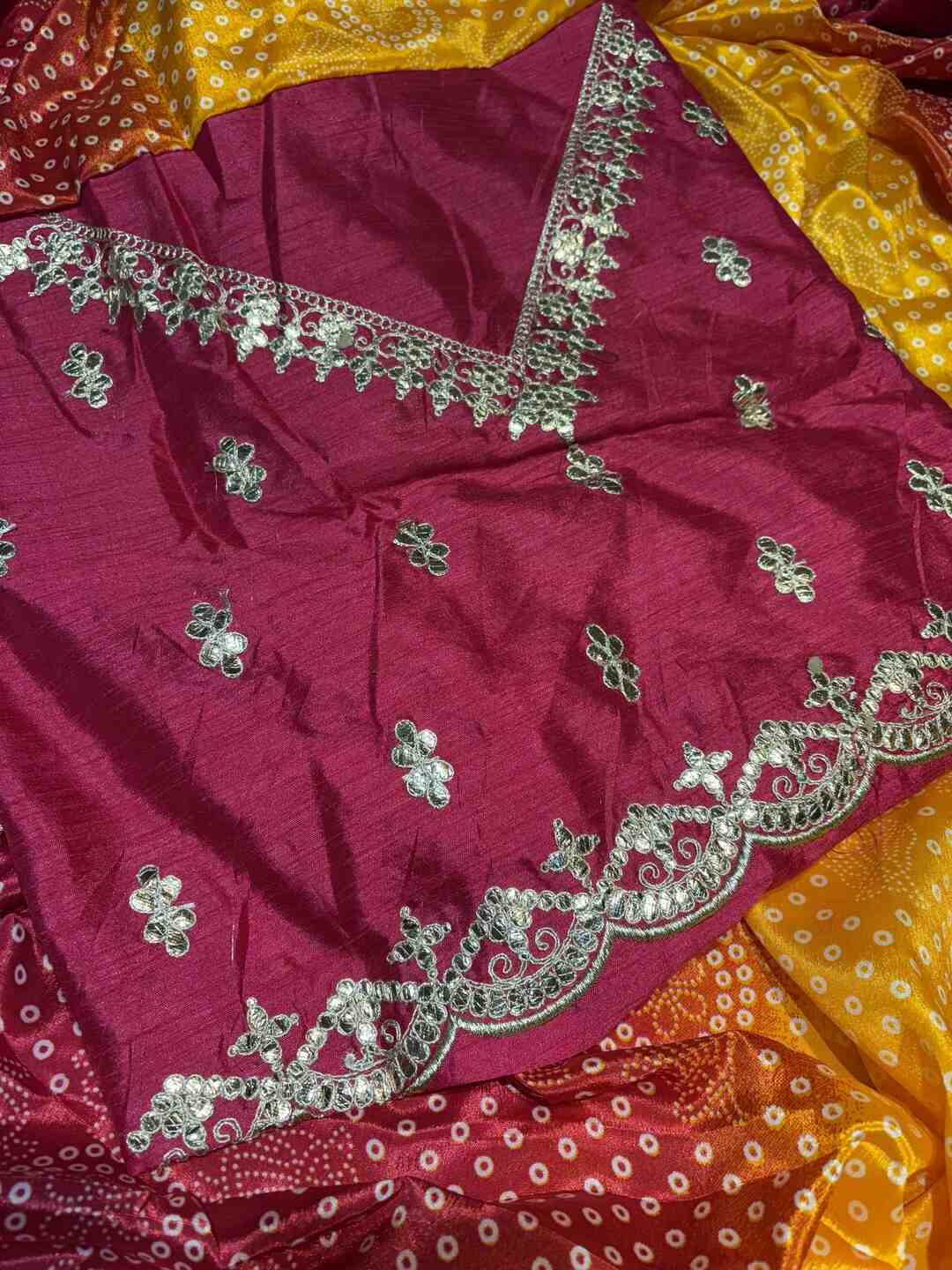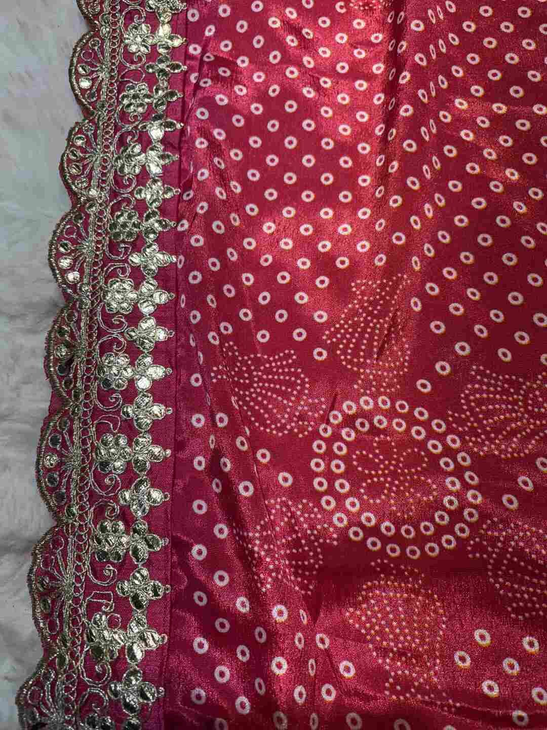 This saree features a classic Bandhej body combined with a Gota Patti border, creating a rich ethnic statement.