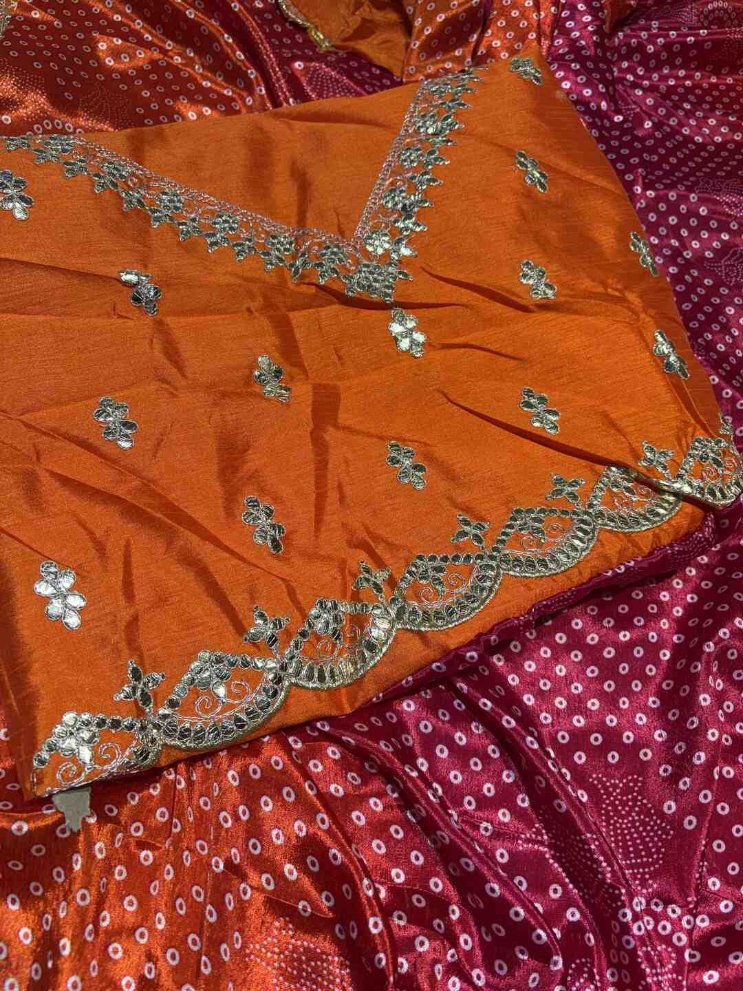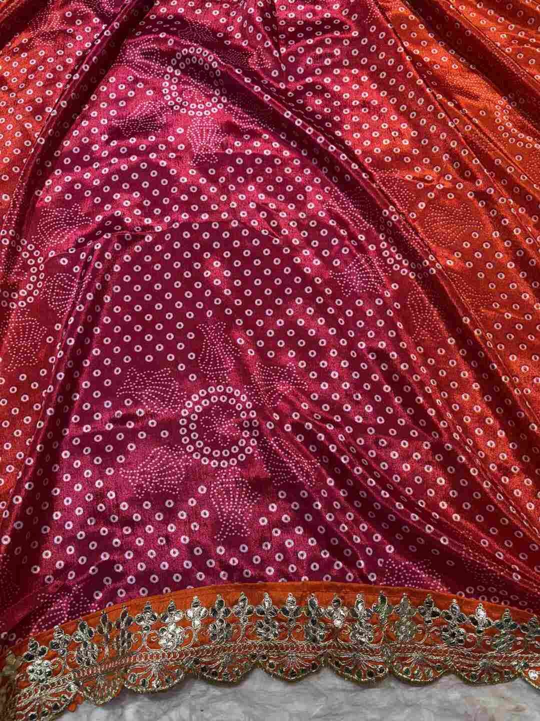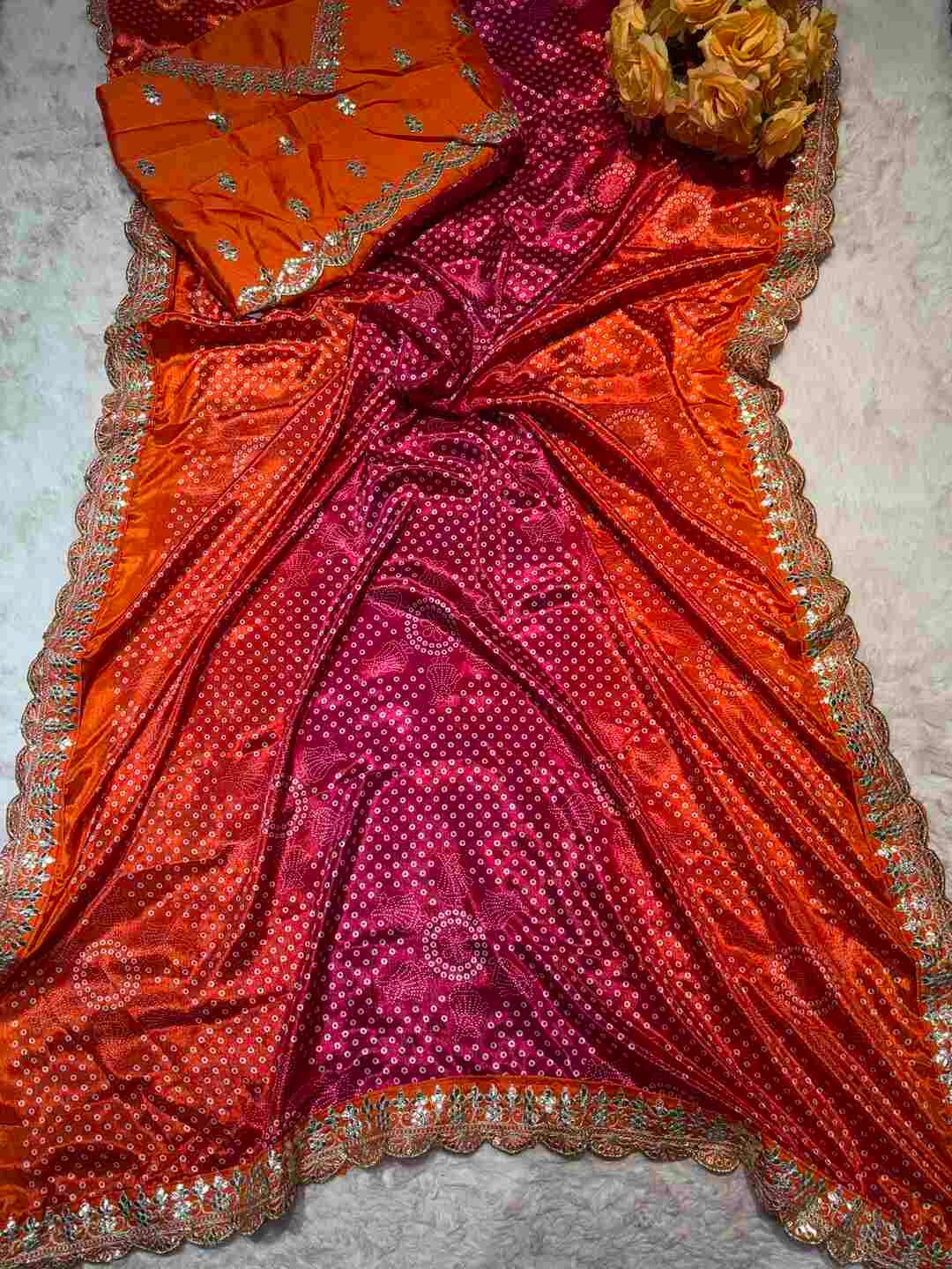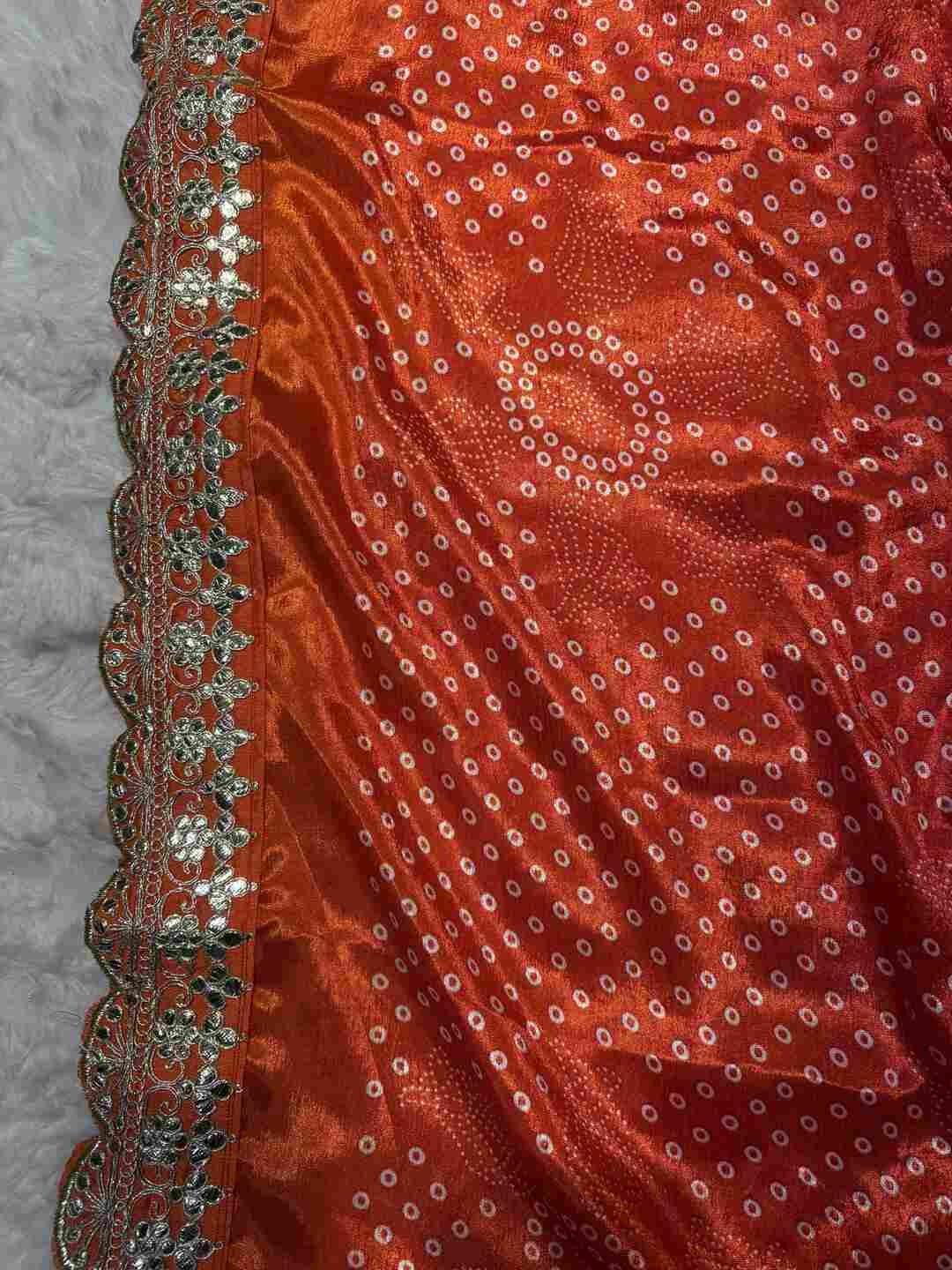 This saree features a classic Bandhej body combined with a Gota Patti border, creating a rich ethnic statement.