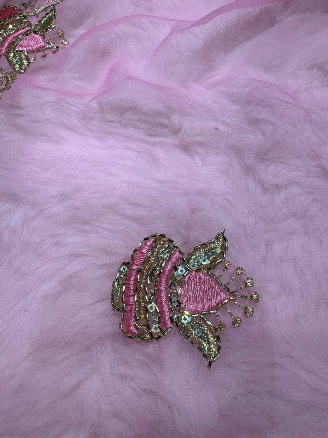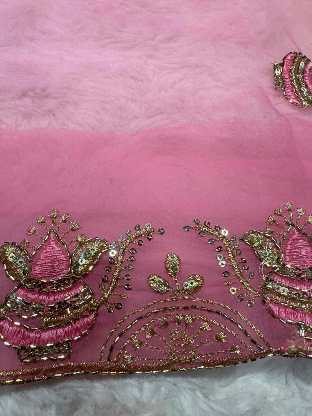 The fabric complements the Darbari concept, giving the saree a regal presence.