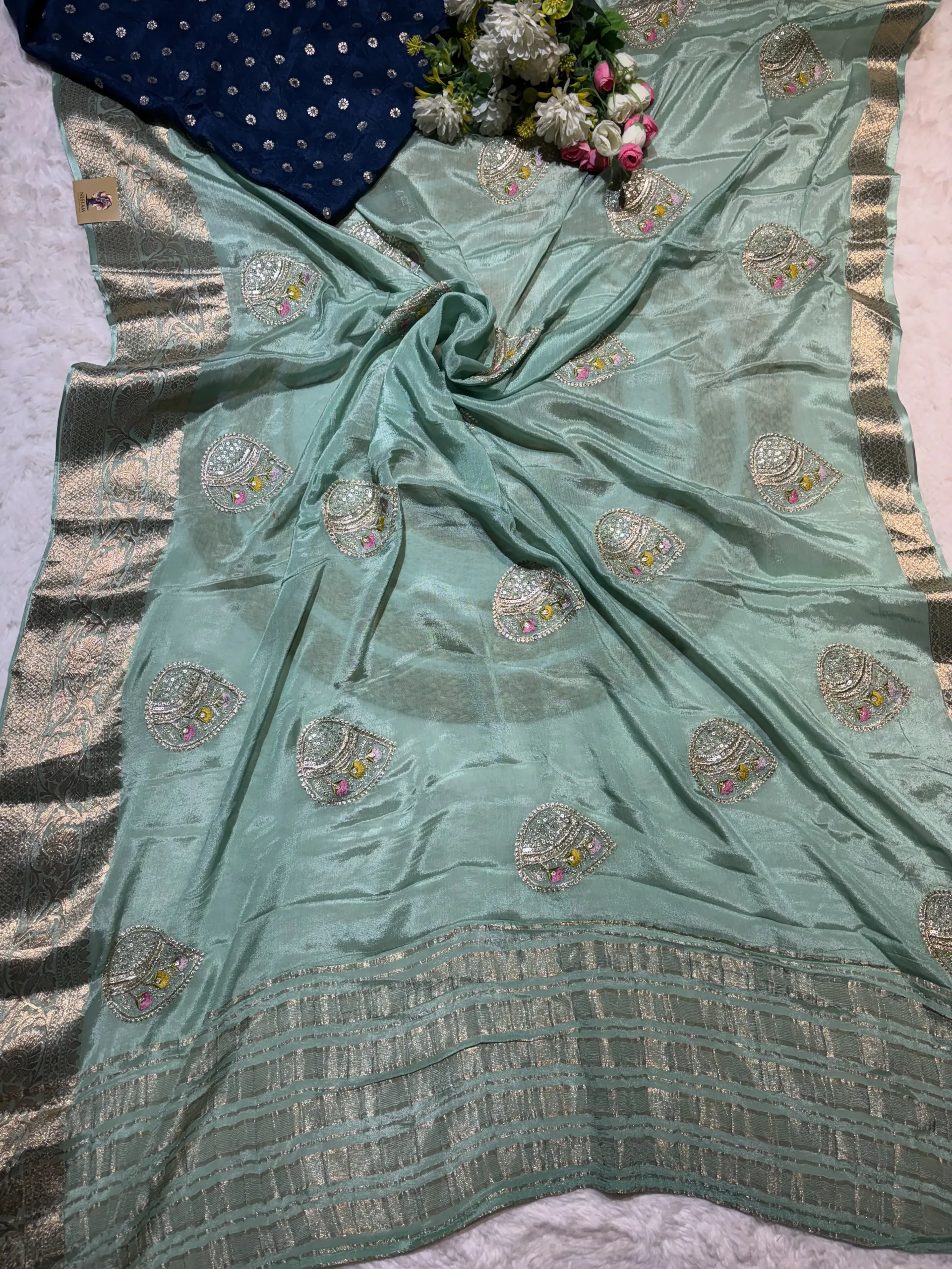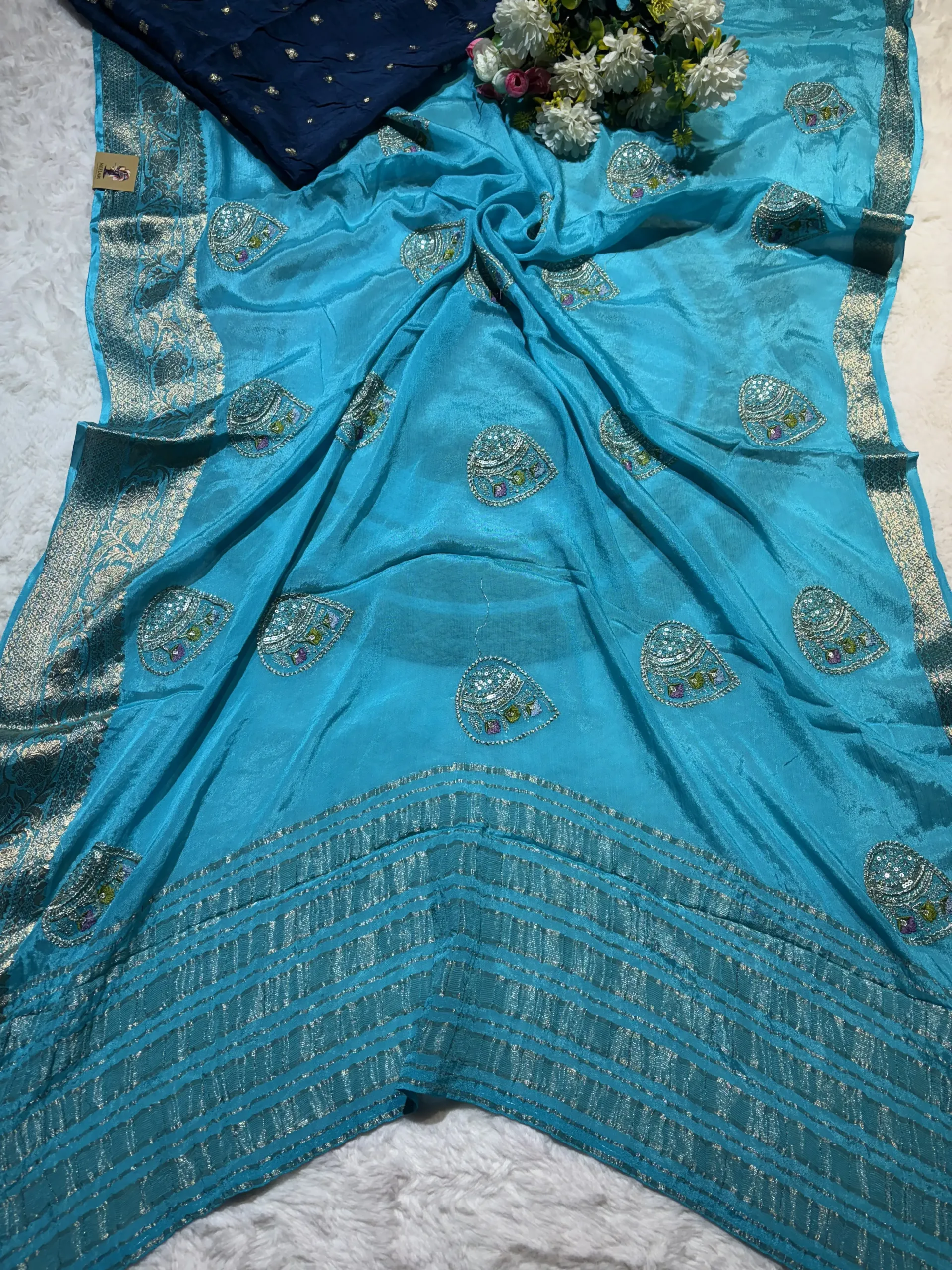 This saree features All Over Kasida Work, elevating traditional craftsmanship with fine detailing and artistic patterns.