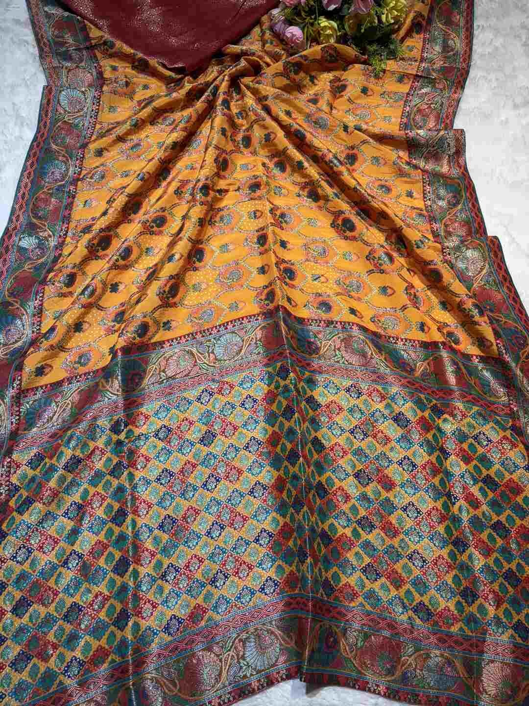 This saree features beautiful Pashmina weaving paired with elegant printed or woven motifs.