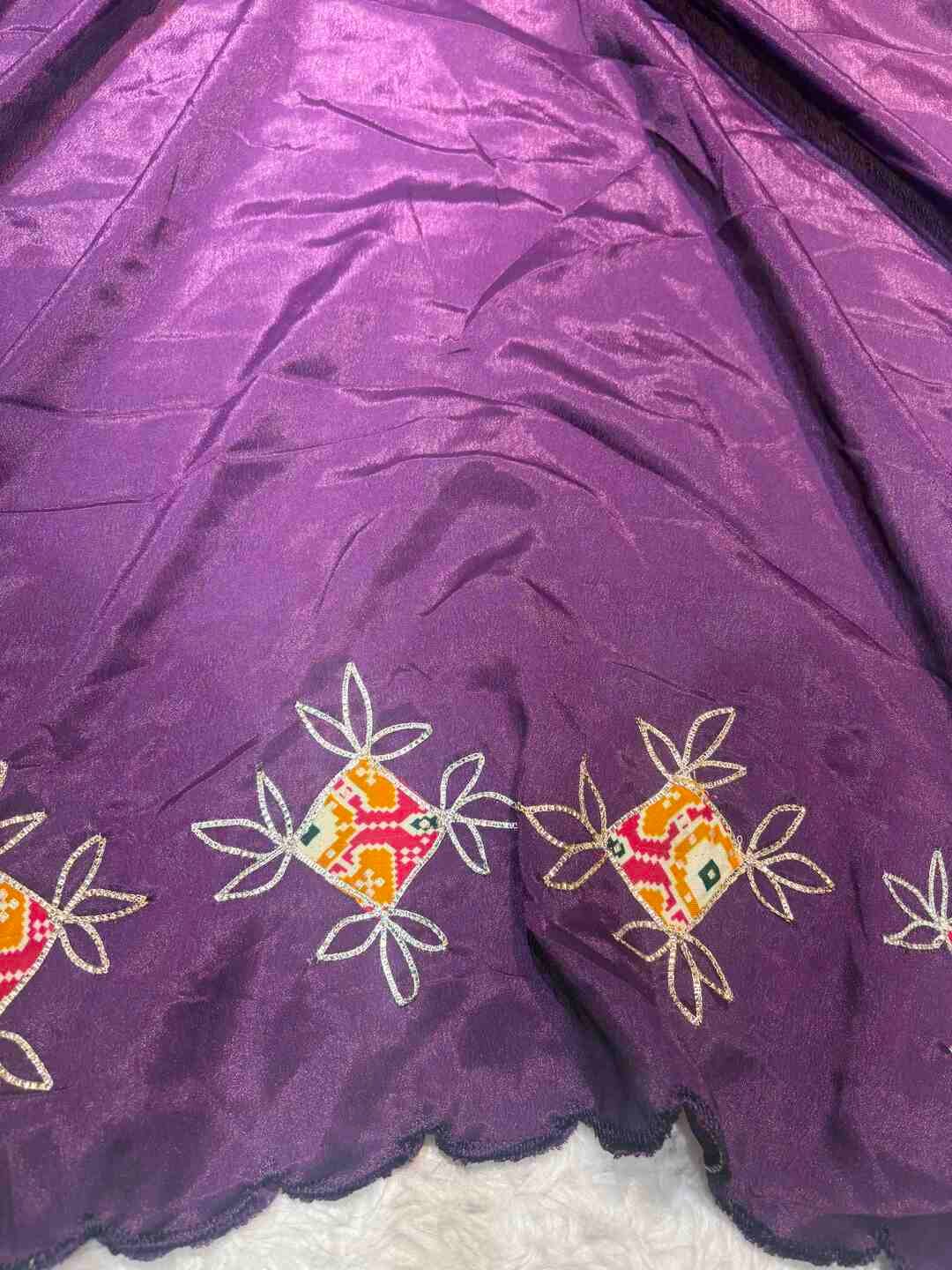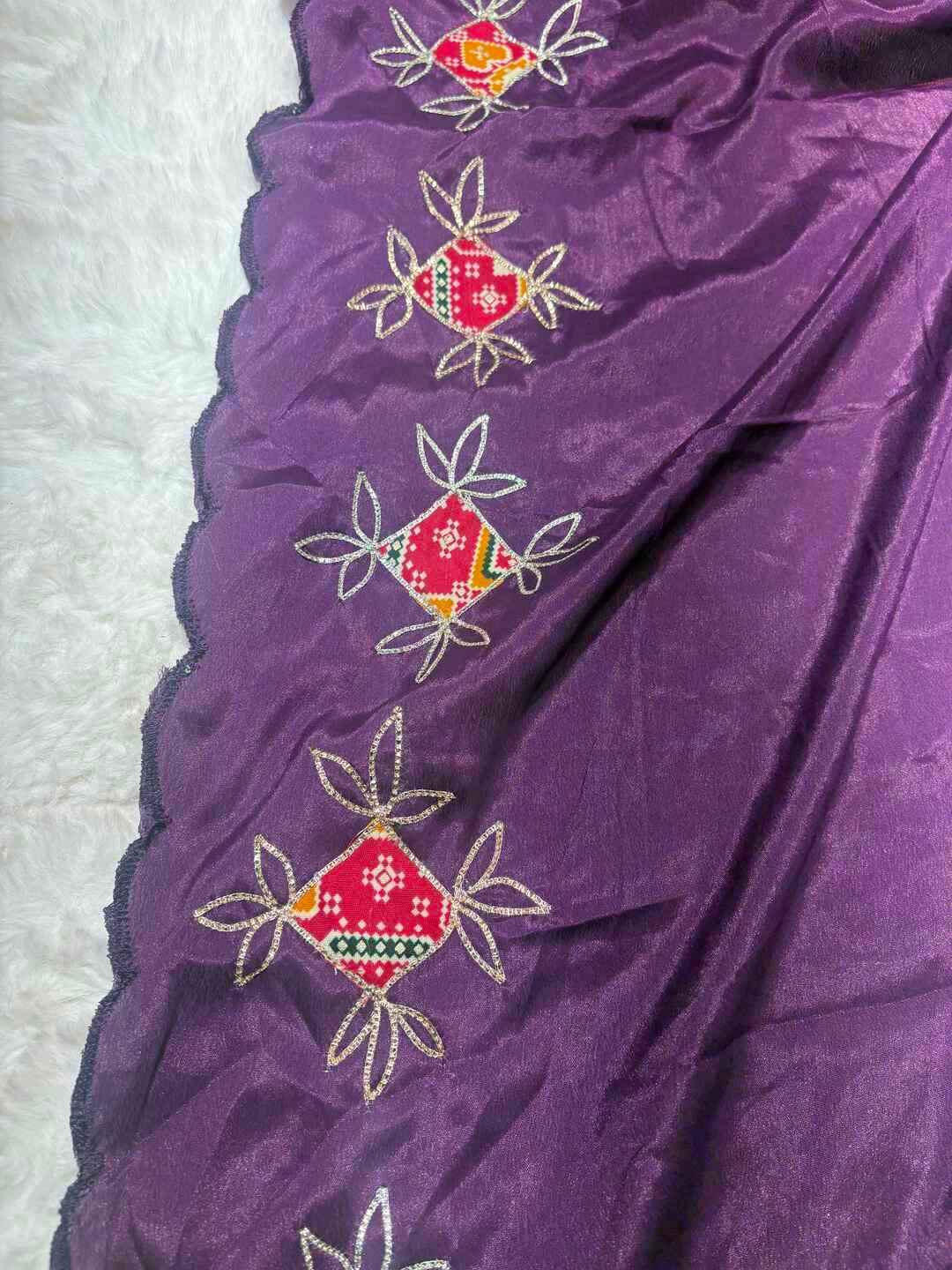 A stunning fusion of artistry: Vibrant Patola prints paired with a stylish stitched blouse enhance the richness of Silk fabric, creating a coordinated, elegant drape that feels traditional, refined, and effortlessly luxurious.